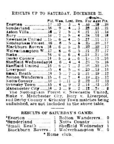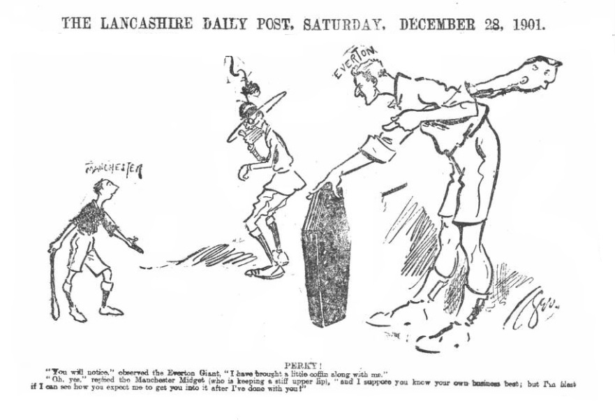 During the last few days Everton have come a cropper from the top of the pedestal on which it has recently been posing. For the Goodison Park club this has been a disappointing and black Christmas. Six points were not only anticipated but booked as a certainty by the club directors out of Aston Villa (at home) and Wolverhampton Wanderers and Manchester City (away). The fruit of the latter may yet be plucked, as this match as we all know, has, owing to the shocking weather, at Cottonopolis on Saturday, yet to be played, but the anticipated harvest from the Midlands has been brutally swallowed by these clubs themselves. It is no use trying to seek for an excuse for the Everton players. They were well beaten by their opponents on each occasion, and the best combination won without a doubt. The public who follow football, are now beginning to scratch their heads, and at the same time ejaculate “I always had my doubts about the championship; Everton’s play is too erratic and uncertain for any such possibility.” The talk is that to sit in committee and work out football problems on a chess-board is too much like the task the present War office officials have set themselves to perform in South Africa and that fads and fancies and problematical lectures are of no use to professional football. League matches are not won in committee rooms, but on the field of play, and the sooner this fact is recognised the better for Everton.