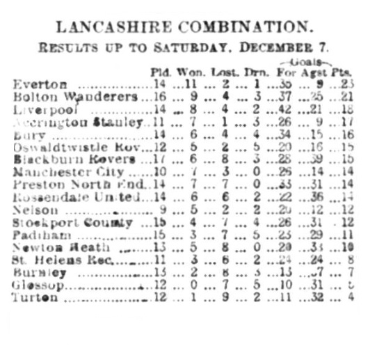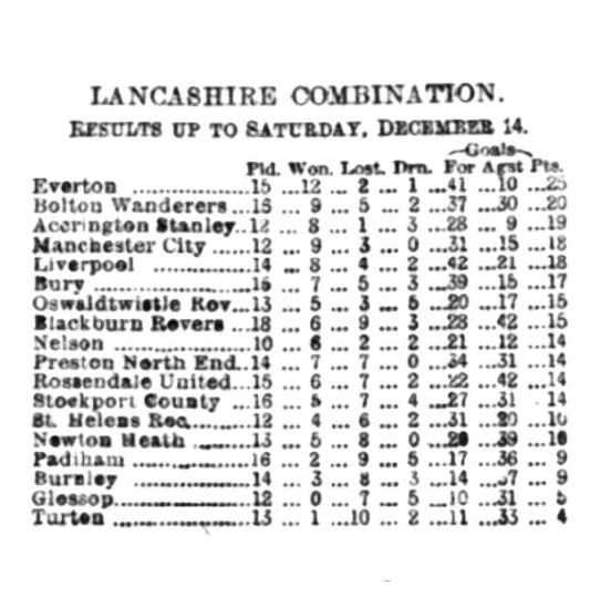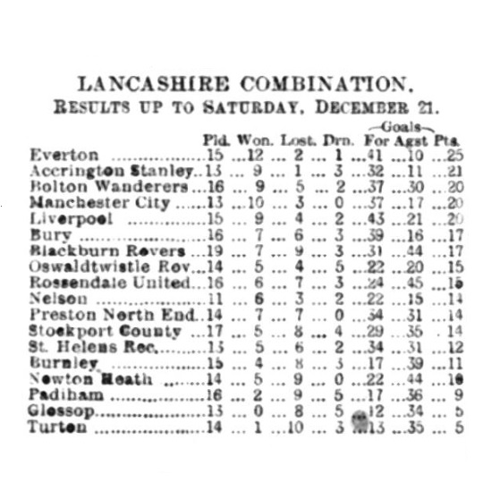 At Burnley. The home side with a strong breeze and the slope in their favour, had the better of the opening exchanges, and then both goals were assailed. The home goal had a very narrow escape, and for a time Burnley had to defend, several spirited attacks being waged. There was no score at the interval. On restarting Everton quickly put on the pressure, and opened the scoring in ten minutes. Everton work down again, and placed another goal, followed by a third, and eventually winning by 3 goals to nil. Everton: - Muir goal, Sharp, and Watson, backs, Boyle (captain), Clarke and Blythe, half-backs, Makepeace, Paterson, Proudfoot, Bone, and Singleton forwards.