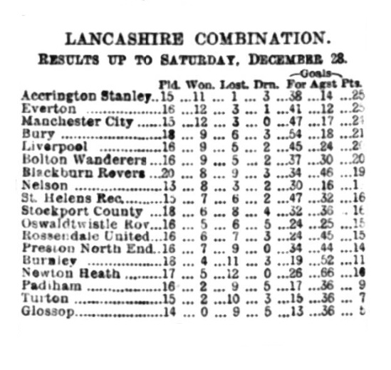 After their visit to Wolverhampton on Boxing Day, the Everton team went straight back to Southport, at which salubrious resort they spent their time quietly preparing for Saturday’s encounter with Manchester City at Ardwick. The men were all in the pink of condition, and they left Southport in good time for play, reaching Manchester before noon. Cottonopolis was found, as usual, to be under dire climatic conditions, and the weather did not improve as Hyde-road was reached. Indeed, it was found on reaching the ground that the playing pitch was almost entirely under water, and beneath this there was a strong coating of ice. Under the circumstances Mr. Lewis, the referee, very wisely decided that play was impossible, and without the gates being opened the match was abandoned. A large crowd waited outside the gates, and though there was considerable disappointment, the wiser section of the community betook themselves cheerfully indoors.