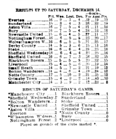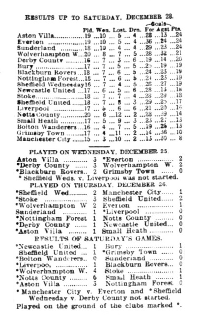 The Everton club have had a disastrous experience during the past week. The defeat on Christmas Day at home at the hands of the Villa came somewhat as a surprise, and an additional reverse at Wolverhampton on the day following was, of course only what one might expect. However, on the play the Wolves were certainly lucky in securing full points, for what appeared to be a legitimate goal was denied the visitors, and everyone who follows sport knows what a damper is placed upon a club's prospects when a questionable ruling it given against a side. During the first half of the game there was only one side in it, but chances were allowed to go abegging, hence the adverse result. The ground was in a wretched condition, not fit for a game of momentous importance, and it was passing strange that Referee Bye should have allowed the contest to take place. At Hyde Road on Saturday similar conditions prevailed, but in this case the referee, Mr.Lewis, declared the ground unfit, and spectators were not admitted. In some respects the decision suited the visitors who were not at full strength, but on the other hand the occasion would have served to test the abilities of Bowman the new centre-forward recruit and Bert Sharp at full back. As Aston Villa successfully accounted for Notts Forest the Everton team had to give place to the Midlanders on goal average, but there can be no question that a big effort will be forthcoming to recover the position