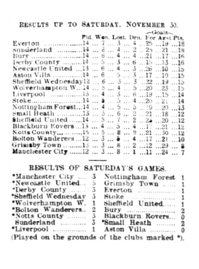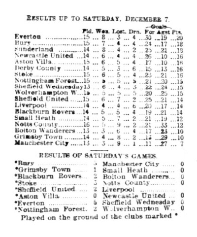 From Wolverhampton the travelled back as far as Southport, there to fit themselves for Saturdays return engagement with Manchester City at Hyde-road. However. a meeting between top and bottom of the League was declared impossible by the referee. Mr. Lewis, Hyde-road being in a fearful condition. Everton intended playing Bert Sharp and Bowman, Young and Eccles being on the injured list.