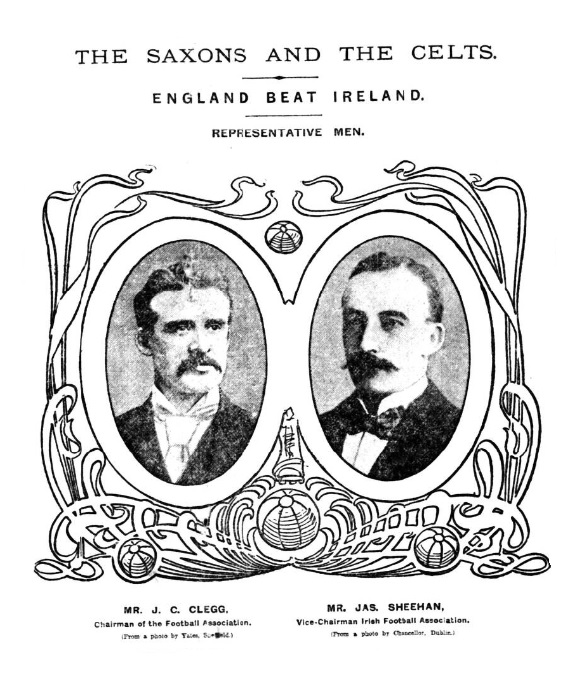 This Association international was played on Saturday at Belfast, before 14.000 spectators. Ireland had five Anglos on the team, which materially strengthened it, but at the last moment Gibson, Ireland famous back, was unable to play owing to an injured knee. Ireland has never conquered England yet, the nearest approach being draw of 2 goals eight years ago. Teams: England.—George (Villa), Crompton (Blackburn Rovers), Iremonger (Forest), Wilkes (Villa), Forman (Forest), Bannister (Bolton Wanderers), Hogg (Sunderland), Bloomer (Derby County), Calvey (Forest), Settle (Everton), Blackburn (Rovers). Ireland-—Reilly (Portsmouth). McCracken (Distillery). Boyle (United), Darling and Milne (Linfield). Nicholls (Celtic), Mercer (Linfield), Morrison (Burnley), (Preston), Kearns (Distillery), and Kirwan (Tottenham). Forman won the toss, and took the benefit of a slight breeze, which tempered the brilliant sun. A momentary invasion by the English forwards was easily repulsed, and then the Irish forwards, led by Gara, swept the English halves aside, but home tram did not reach scoring distance, as Crompton and Iremonger closed in, the former sending the ball well down the field. It was a fine open game, full of brilliant touches. The Anglo-Irishmen especially showed up well. Midfield play was followed by an attack on the Irish goal, Hogg, Calvey, and Settle having shots, but Reilly was too much for them, Portsmouth man being in good form. The passing improved as the game went on, and so did the shooting, but the interval arrived without score. Ireland restarted with ten men, Milne having had a bad knock. The home men, with the wind and sun their backs, immediately pressed, and George was given a busy time. A penalty kick was given against Iremonger, and Milne was entrusted with the kick, but his countrymen had the mortification of seeing him send the ball Into George's hands. Continuing to hold the upper hand, the Irishmen had hard lines in not scoring, but they found impossible to beat George, who gave a very fine display. Play again transferred to the Irish half, and for fully ten minutes the Irish defence had to exert themselves to the utmost to prevent a score. A concerted movement ended in Settle scoring.