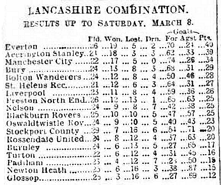The return Lancashire Combination match between the reserves of Everton and Liverpool was played at Anfield-road in splendid weather. The game at Goodison-Park had resulted in favour of Everton, by two goals to nil. A splendid crowd turned out to witness the game, and when the teams faced there would be fully 10,000 present. The sides were: -