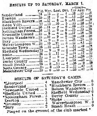 It was almost too much to expect Everton would bring back a victory this time from Stoke- that they did so, however, is very satisfactory. Their success has given them a wonderful jump upwards, for instead of being sixth on the list they now occupy second position. That they- or any other of the League clubs for the matter of that-will now be able to displace the Wearsiders from their exalted place seems impossible, for Sunderland by their victory on Saturday have secured a strong lead. It may be mentioned that these two games (Everton v. Stoke and Sunderland v Blackburn) have had rather a peculiar effect on the Rovers’ prospects. If the latter had won against the Wearsiders, they would have been a point in front of Everton, and only one behind Sunderland, and they would have become a strong fancy for championship honours. It is remarkable what a couple of points mean. Sunderland have now beaten the Rovers six times in succession. With regard to Everton’s victory, it was never certain; it was more lucky- we won’t say fluky-than otherwise, for when Abbott managed to score the winning goal expectations were on the other side. Stoke having been “pressing” most of the second half, and were, in fact, “clamouring” for a goal when the Everton forwards broke away, and enabled Abbott to score what was a very valuable goal. Lucky perhaps for Everton, the whistle went just afterwards.