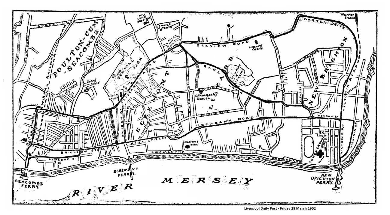 The plan given above shows what may be styled the inaugural scheme of the Wallasey Council for providing the district with proper means of transportation. The ultimate scheme will give something further to the residents in Poulton and Wallasey, who have not yet been catered for, the morethickly-populated parts having received the first attention of the Tramways Committee. The plan shows that the whole of the route from Seacombe to New Brighton Ferry is tapped by the two lines already opened, and when the third has been entered upon the district round Hose-side and Warren-drive will also have its needs met. Although shown as completed on the plan, the loop from Liscard Village along Seaview-road and Warren-drive is not yet opened, but it is hoped it will be in working order before Whitsuntide. The routes are follow: —1. Seacombe Ferry, Demesne-street, Brighton-street, King-street, Seabank-road, Rowson-street. Victoria-road, and the Horse Shoe at New Brighton Ferry—distance. 2 ¾ miles; 2. Seacombe Ferry, St. Paul's-road, Wheatland-lane, Main-waring road, Liscard-road, Liscard Village, Rake-lane. Rowson-street-Victoria-road, New Brighton Ferry—about 3 ½ miles; end 3. Seacombe Ferry and the same route as the last Liscard Village, then along Seaview-road, Hose-side, Grove-road, Warren-drive, past New Brighton Station, and down Victoria-road to the Ferry, the return from New Brighton in each instance being through Virginia-read into Rowson-street. The third route is about 4 ½ miles in length. On the No. 1 service the return route goes along Brighton-street for its full length, instead of Demesne-street, as on the outward journey. The cars have been designed largely on the Liverpool pattern, but we understand that the experiences of passengers have already resulted in a demand for the Birkenhead staircase, and the drivers also express preference for it as making their post a safer and consequently a less anxious one. The double-dock cars accommodate twenty-two passengers inside and thirty-four top. The fares, so far, is 2d for the full journey on both routes, with three overlapping penny stages.