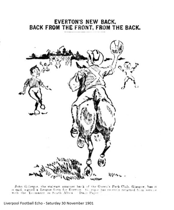 Following on the departures of McColl and Stewart to Newcastle, the Queen’s Park supporters were somewhat surprised yesterday on reading the statement that John Gillespie, the stalwart amateur back, had signed a League form for Everton. It is trusted that the calls of the Everton club on him will be few, as the Glasgow club is likely to need his services for the Scottish ties. Gillespie recently returned from South Africa, where he served a term in the Yeomanry, and is a very fit at present.