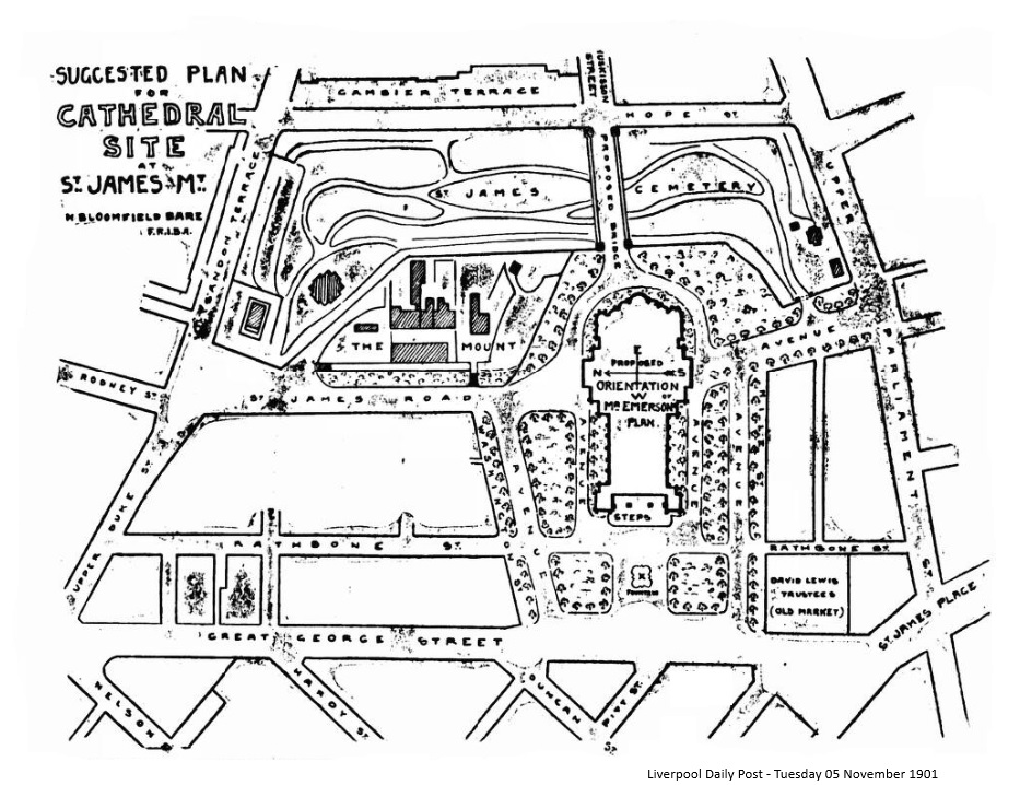 Seeing that the picturesque aspect St. James Cemetery, as it exists, accords so well with this suggested scheme, it would seem, perhaps, unnecessary to acquire land on that eastward side. Taking cathedral foundations down into the depths of this old quarry, and the consequent disturbance of graves, would undoubtedly prove a very troublesome and expensive affair, and funds would assuredly be wasted there which might more profitably be out-layed in extension of the site westward. At the same time, the suggestion which has been made to throw a bridge from Hope-street across the pretty ravine to the cathedral platform would make, without any great extravagance, a fine addition to the general scheme of the site. One word as to the ground levels, or rather gradients. Very obviously, the original surface face contour sloped before the quarry was dug from Hope-street to St. James-road, and continued down to Great George-street. Good rock foundation will be found throughout within a few feet the original surface. The artificial “Mount”is probably composed mainly of debris from the quarry. It may be deemed advisable to reduce this in part to the original surface, and the cathedral floor, if placed near upon the St. James-road level, would have easy approach to north and south transept entrance and the further drop in the ground would be met by the flight of steps rising at the western entrance to the nave, making a stately approach from the open square or "place,” retired off the great main thoroughfare. In concluding these remarks, I express the hope that all classes of the community may be enlisted to concentrate their energies towards obtaining the noblest building of its time upon the finest and most perfect site it is possible to make.- Yours, &c., H. Bloomfield Bare, F.R.I.B.A. 12, Prince’s-road, Liverpool, Oct 23, 1901.