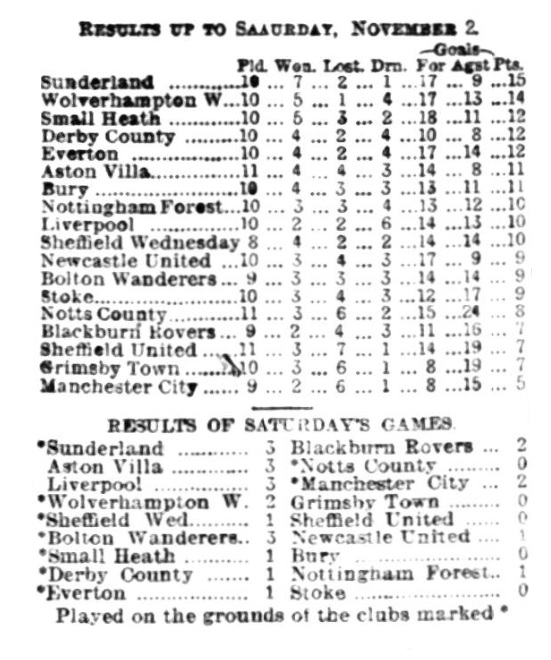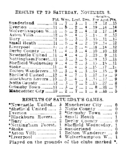 By their victory over Small Heath-a close one, it must be admitted-Everton now stand two points in advance of Sunderland, who at present occupy second position in the League tourney. Recently the Goodison Park team have had a good run of luck in the competition, and it is some consolation to find they have got back to the fine form which distinguished their play in the first month of the season. When in the mood they can give as fine an exposition of football as any team in the country, but unfortunately they are not always moved to that desire. They gave a grand display on Saturday against the dashing Midland combination led by Athersmith, who turned a stubborn defence on the Everton attack, and so close was the finish of the game that the final whistle of the referee came as a positive relief. The match could have been lost to Everton almost at any period of the game if the visitors had been favoured with the smallest possible bit of luck; for one thing their shooting was decidedly bad- probably spoiled by anxiety. Young has improved a lot in his work at centre, and makes a capital pivot for his wings and shows excellent discernment, especially in playing to Bell and Settle, whom he appears to mainly depend upon for results. It ought to have been more than a one goal victory, and in this respect the visitors came off very fortunate as many of the clearances were merely accidental. However, the early goal by Bell gave Everton two points, and if a dozen goals had bene booked the victory could not have counted more.