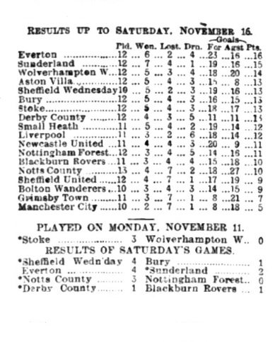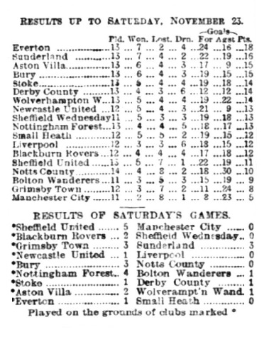 By their exceedingly clever victory at Sunderland Everton placed themselves at the head the pf the League table, and on Saturday they further strengthened their position as leaders by beating Small Heath at Goodison Park by one goal to nothing, not a great margin certainly, but sufficient to give them the two points. There was, of course, a great crowd welcome the conquerors of Sunderland, 15,000 paying for admission, so that there have been 17,000 spectators, and this despite the fact that there was a certain amount of fog to be contended with, which caused therefereeto start the game five minutes before the advertised time kick-off. It was as well that he did so, as the light was none too good in the closing stages. So far I could see both teams were at their best strength, and a good game was anticipated.