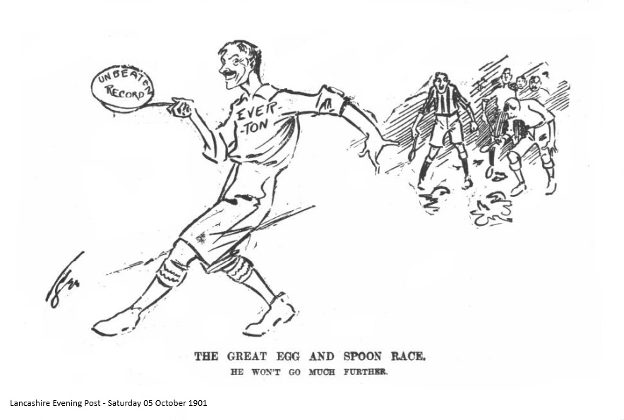Whatever has come over the Everton League team? One could almost imagine they had got bewitched or something of the kind. The first month of the season they played in brilliant fashion, and went along, joyous ignorant of what awaited them during the next four weeks. September set the club top of the pedestal; October has given it a great fall. The “flop” has been as disastrous to hope as ever was that sustained by “Humpty-Dumpty.” It was really distressing to look on and see the way the Rovers during the last half-hour or so of Saturday’s match shepherded them; the Everton players were driven like a flock of sheep, and were just about as harmless. The play of the forwards was purposeless, while the defence was broken and disheartened. It was a shocking exhibition of weak-kneed football, and thoroughly unworthy the aspiration of a club like Everton, for the whole of the team appeared to collapse like a bursted penny balloon. It is not true form, for if there was one thing we used to pride ourselves about it was the “staying” powers of the Goodison Park contingent. There is blundering somewhere, and this should be hunted out. Judging from the results of the two games played by the club on Saturday it would appear as though the directors had left the best team at home to face the Rovers Reserve, if things go on as they are much longer the proper thing to do will be to rename the teams and let the Combination become the League and vice-versa. The result at any rate could not be worse. The Rovers during the week have accomplished a great feat; they have beaten both Liverpool and Everton. Saturday’s victory, however, has not improved their position in the League table, as the Blackburn Club still figures third from the bottom. It will be a sorry spectable for the Goodison Park spectators if next Saturday Stoke give Everton a further drop.