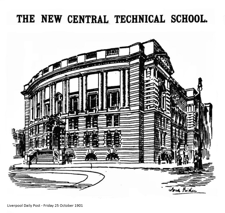 The new Central Technical School and Museum, which is to-day to be formally opened by the Duke of Devonshire, President of the Council, was designed by Mr. E.W. Mountford, F.R.I.B.A., of London. On the suggestion of the Library, Museum, and Arts Committee the design was in some respects altered; the arched pediments of the frontage to William Bronw-street being replaced by pointed pediments, as more in keeping with the adjacent building of the Brown Museum. The contractors for the buildings were Messrs. Joshua Henshaw and Sons, of Liverpool. The site comprises 2,900 square yards, and the height of the elevation to Byrom-street, which, with its sixteen tall Ionic columns is very striking and bold, is 84 feet. The excavations for the foundation were in solid sandstone t=rock of the Triassic formation. The basement, ground floor, and first floor are occupied by the offices, lecture halls, and classrooms of the Technical School. The two upper floors are museum galleries, and the effect of this extension is to enlarge the Museum to three times its former size, so that, after the British Museum, it is now the largest in the United Kingdom. The chemical department of the Technical School is, however, placed at the top of the building in a cross gallery specially designed for the purpose. It comprises a lofty and spacious laboratory. On the top of the building also is an observatory, fitted with an equatorial telescope and transit instruments for the use of the nautical College. The building is constructed of Darley Dale sandstone, technically known as of the “millstone grit” series. Ancaster stone, of finer and softer quality, is used for the bases and capitals of the pillars of the interior. This stone was quarried at Grantham, Lincolnshire. The steps and landing are of fine-grained Shelpey flags, obtained near Huddersfield.