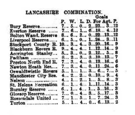 Everton Combination- Muir, goal; Eccles and B. Sharp, backs; Boyle, Clarke, and Brown, half-backs; Roche, Rankin, Proudfoot, Bone, and Chadwick, forwards.
