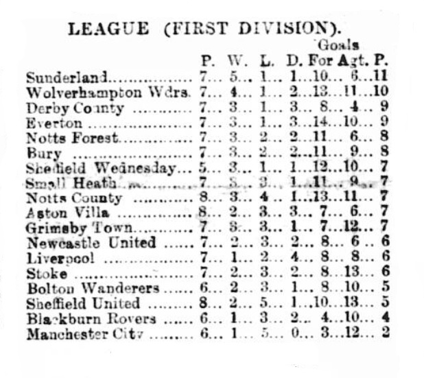 Saturday last was the first match the season in which Everton have not had a man hurt. That may be to Bury’s credit, though I rather think the Toffees’ caution was a contributory cause ; Sharp was palpably nervous and disinclined to take risks, and probably some of his colleagues had the fate of their crippled brethren in their thoughts. Poor old Liverpool could not boast even one day’s exemption from accidents, for the Welsh half. Parry, was knocked out in the second half, making five men who have been placed the injured list since the kick-off. Everton have had four, irrespective minor casualties. It has been suggested that the two clubs should combine to start a Cripples’ Home. Everton were never nearer their first defeat of the season at home than they were last Saturday. Bury fairly held them the first half, over-ran them the second, and scored what I have little doubt would have been the only goal the game had it not been played at Goodison. It is on these occasions that the advantage to a team of playing on their own pitch is seen; the shame of being beaten before their own supporters nerved the Toffees to concert pitch. But Bury were the better team on the day’s play, and if that is an average specimen of it, their place in the League table ought to be above Everton and not below.
