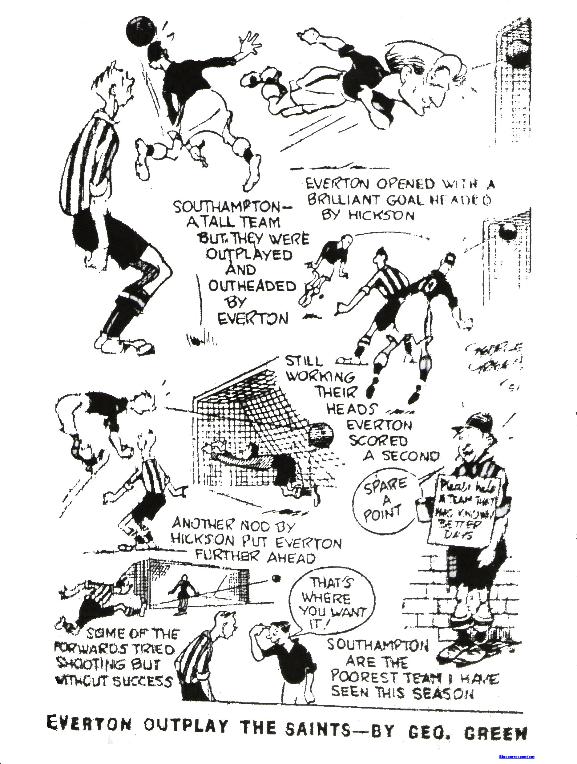 Now the Blues revert to the right wing which played such an important part in the revival for Tony McNamara and Wally Fielding pass through fitness test yesterday and so resume their happy partnership, I regard “Fielding” return as having a tremendous bearing on the game. Fielding has been in brilliant form of late. The Saints may will not decide on their team until tomorrow morning, but it is expected that Tommy Bogen the Scottish international, signed from Aberdeen this week will be making his debut at outside right. Tommy was previously with Preston and Manchester United, so is no stranger to English football or Goodison Park. This match starts at 3.15 p.m. and I am confident that the Blues can win and get back to the point per match level. Everton; O’Neill; Clinton, Lindsay; Donovan, Jones, Farrell; McNamara, Fielding, Hickson, Parker, Eglington.