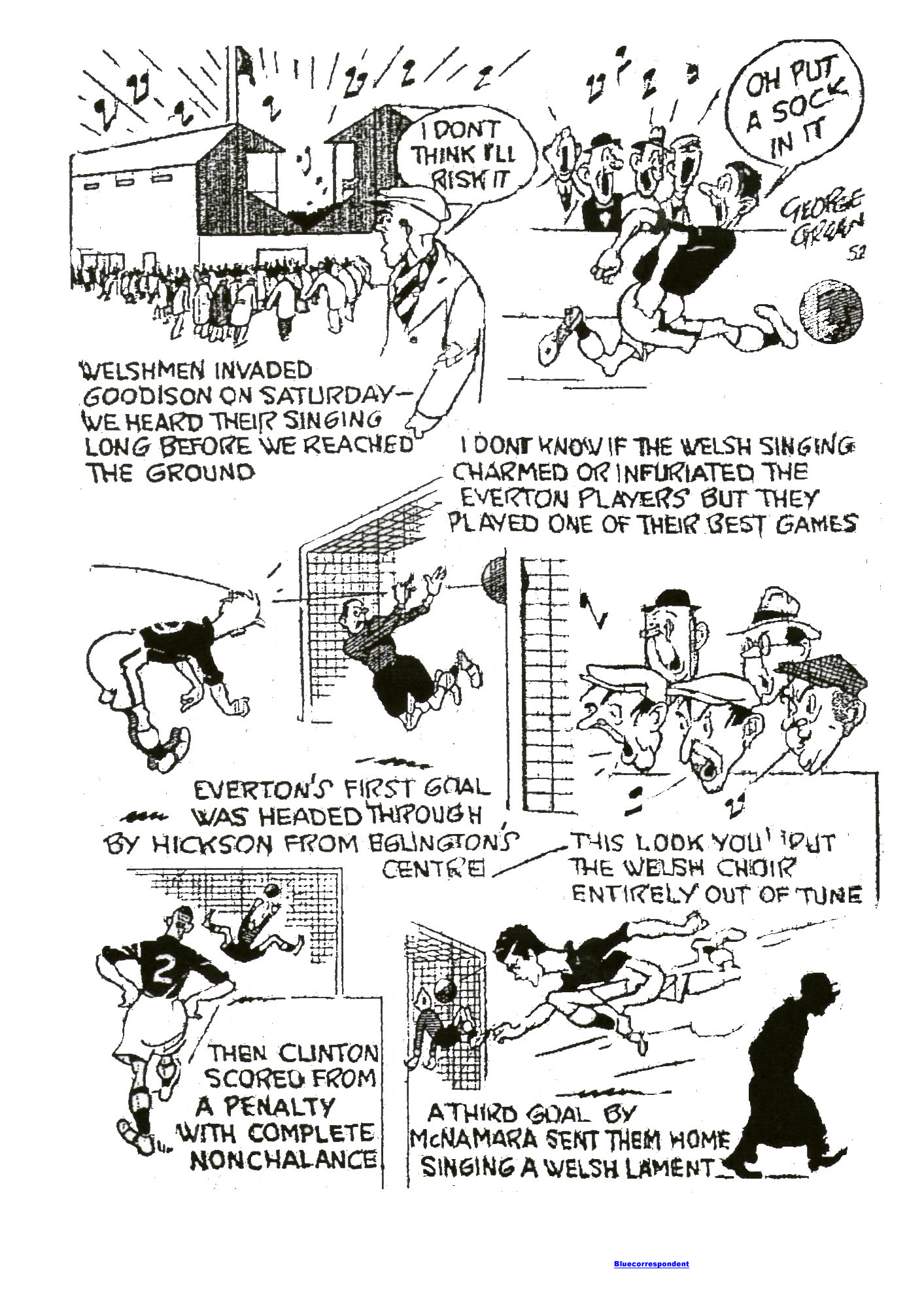 “Clinton suffered little by comparison with his steady partner Lindley, for the most parr, held a tight grip on Briggs and used his head to cut out many menacing centres. O’Neill in another encouraging performance in goal, and Eglington and Farrell contributed their own share to a great victory. “But to my mind, the really outstanding feature of the game from an Everton viewpoint was the studied constructive play in Cyril Lello. Here we saw Cyril right back to his best form of two seasons back. He was faster, strong in the tackle ad invariably loosing the ball to advantage. Everton have no fear regarding the left half berth while Lello continues in this standard. The Blues took the spoils in this game because they were the superior football force, and because they adapted themselves to the snow capped surface more readily than did the city. Even when Stewart equalized Everton were not shaken out of their stride, and one always felt confidence that they would emerge the masters. They were always better balanced and this vital factor redoubts to the thoroughness of trainer Harry Cooke, who made a special journey to St. Andrews on Saturday morning and spent the lunch time striding the players boots especially to fir the conditions. This was “back-room work” which paid handsome dividends.”