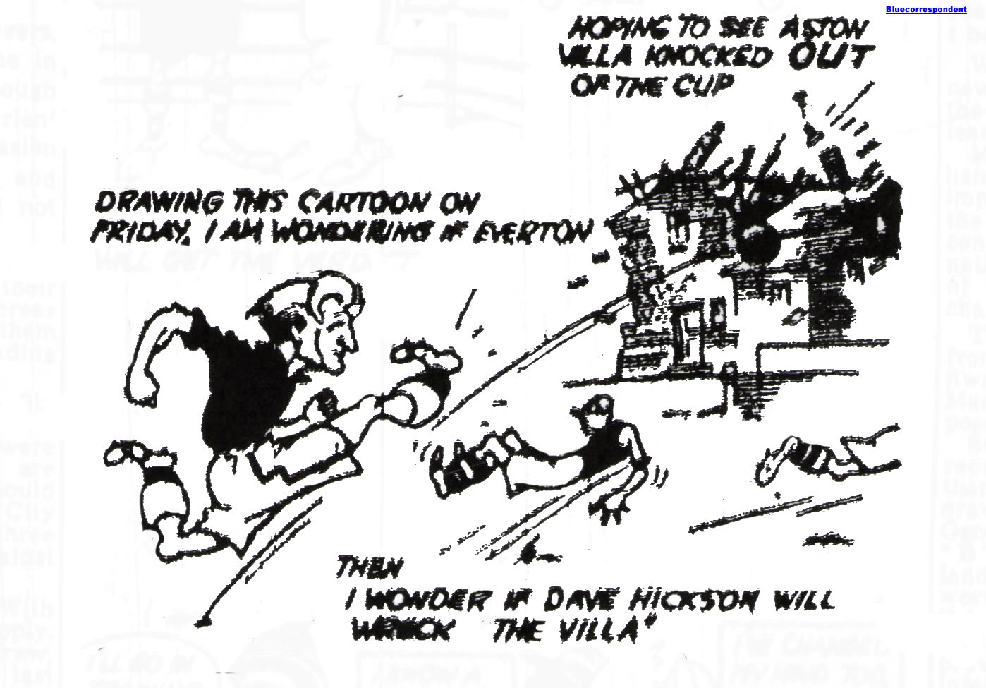 Were Everton to find the inspiration of their day of glory against Manchester United we could be sure of their further appearance in the tournament. But (if the dangerous process of tying up League and Cup football threads id not resisted) the Everton of post Manchester United has not been convincing. Only if they find their fire and fight again will they succeed in this, their first away Cup venue. On fitness, on enthusiasm, on refusal to be beaten, Everton will base high hopes. The experienced Villa defence may possibly find themselves pushed for pace and in that event Hickson and Eglington might well have the promence they had as chief architects of their club’s previous win. How the Hickson-Frank Moss duel goes must have much bearing on the game’s result another important personal battle will be that between Dick Dorsett and George Cummins. We know Dorsett of old, as friend (he guested with Liverpool during the war) and for and veteran, though he may be no one can deny that he knows most of the answers. Everton expect Tom Jones to master Irishman Dave Walsh. This again is a clash of personalities. No one can help admiring Jones because he not only plays his man out of the game but does it with such admirable-balance and gentlemanliness. This latter may be a quality much missed in Cup- ties and all referees today will keep a sharp eye for heavy weather. Soccer football has lost none of its masculinity when clubs shapes toward the glamour and monetary reward of semi-final and finals. Everton for so long rather in the cold through non-successes have a wonderful chance today to prove their current Cup form reliable. They have everyone’s good wishes in facing Villians in their own country.