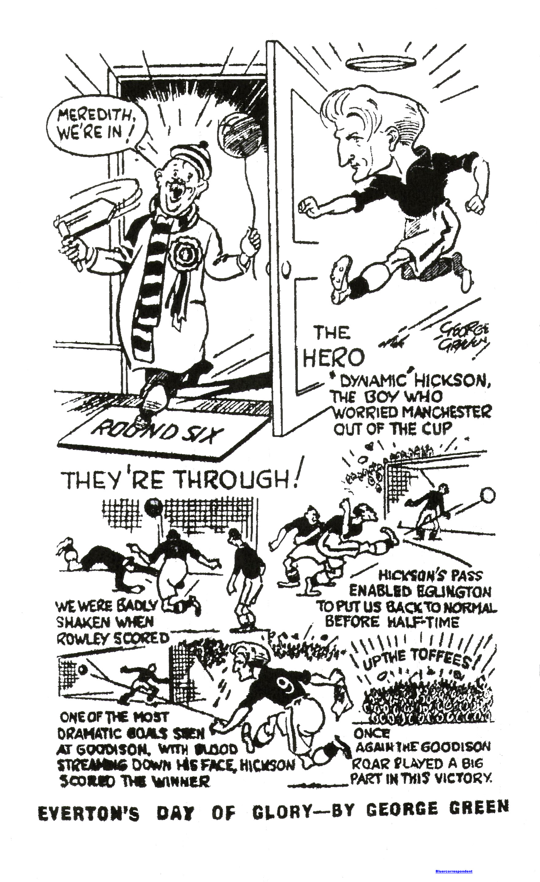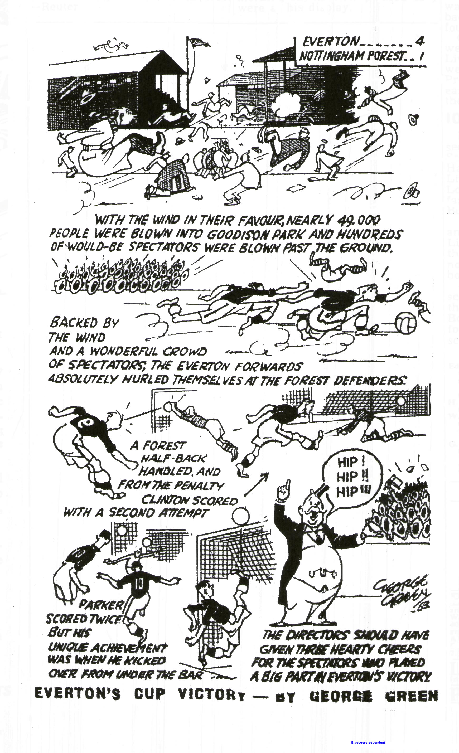 “Then there was George Cummins, one of the Irish lads, who were a grand schemer in the forward line. The only blot on George’s display was that e lost is wool a bit early on. Once he took a swipe at the Forest fellow. Mind you there ‘ad been some provocation –good word that Jimmy –but it wasn’t like the old Everton to see that sort of thing. Maybe, being Irish, the blood of George’s acesstors came to the top. Perhaps the lad didn’t know but wot ‘e was back at the Battle of the Boyne. “There was another Everton laddie wot also tried a spot of retaliation, Jock Lindsay they called Im. Jock ‘ad suffered one or two aggravating things fur wot must have riled him, for he was usually as mild as this ‘ere beer, and a real stylish back. Still, itre typical cup football and with their strong ‘arf-back line and lively forwards smartly led by a youngsters called ‘Ickson the Blues well deserved to win.