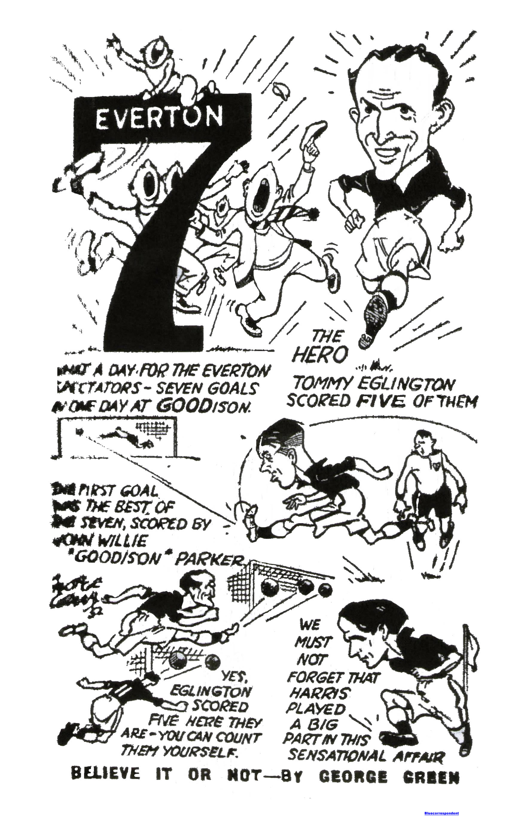 Eglington has written his name in football annuals in a manner that dozens of outstanding wingers of former days never achieved. To mention a few at random, one recalls Alec Troup, Fred Hopkins, Billy Smith, Louis Page, Fred Tunstall, Ted Vizard, Arthur Dorrell and a host of others brilliant players all of them and often prolific scorers but never did the good fortune to register a nap hand come their way. Louis Page once go six for Burnley but on that occasion he was playing at centre forward not his usual; outside left berth. Incidentally, while on this topic –and not as an optimistic indication of future Eglington hopes –the highest seasonal aggregate of goals by any winger in English football is 36 scored by Billy Meredith for Manchester City 54 years ago. Ken Dawson when playing for Falkirk once scored 87 goals from the wing in three successive seasons, but never had the same success when he joined Blackpool. In order to keep the records straight for I foresee a spate of queries from readers for years ahead about this Eglington feat let it be noted here that four of the Irishman’s goals were in succession and that three came from his left foot and two were headers. To my regret I did not see Eglington’s performance. I only returned from Scotland yesterday but Contact who was at Goodison tells you about the match below.