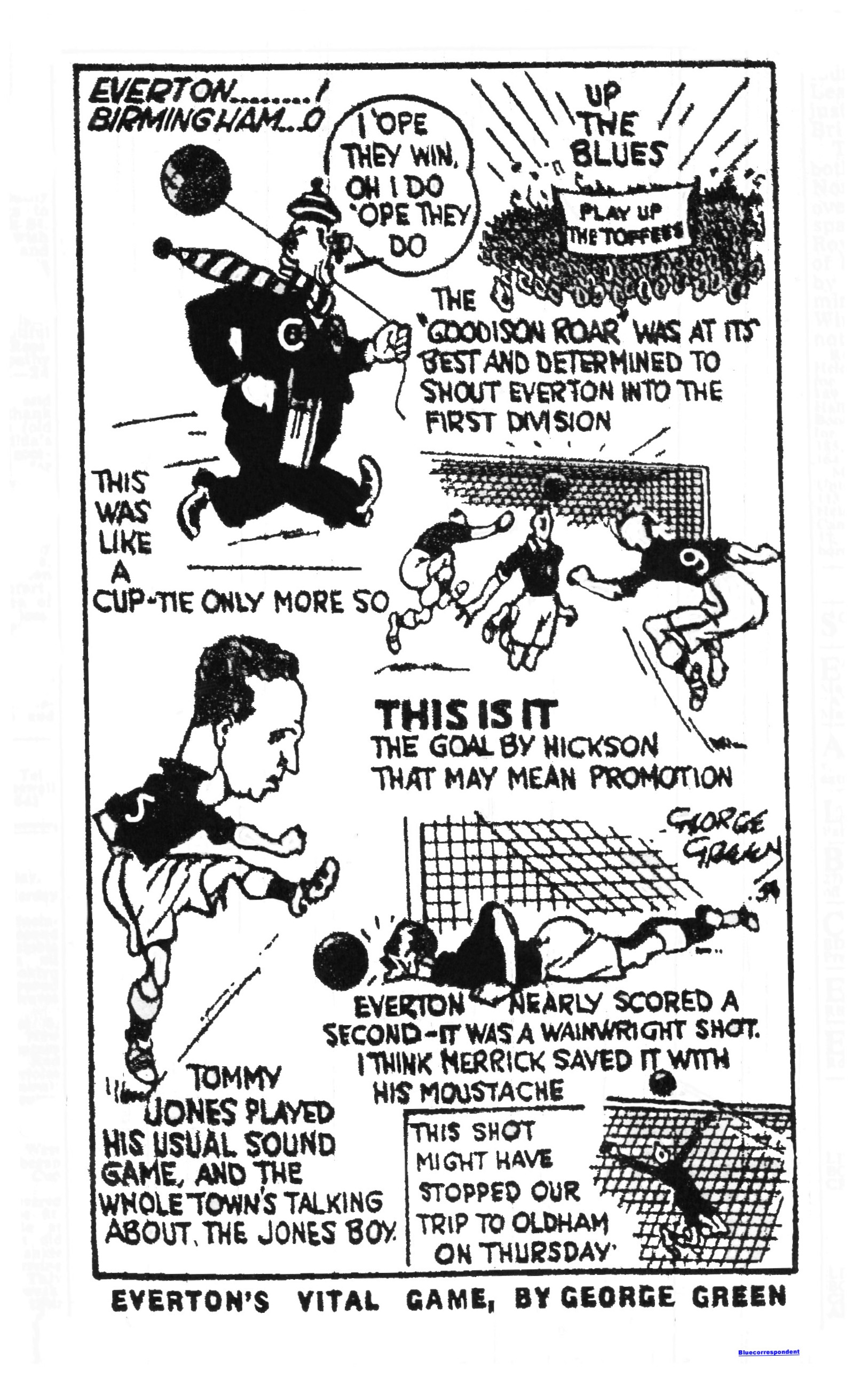 When thank goodness this promotion business was satisfactorily settled last night with Everton pulling of the all important victory of the season to preserve First Division football in this city for next winter, and thus relieving in the most acceptable manner the extreme tension of the past five days. Curiously enough the tension on the field of play was rarely in evidence at Boundary Park until the outcome of the game was clear beyond all fear of an Oldham recovery. Then it was marred by a succession of ill-tempered outbursts which were no credit to football though in some instances it must be conceded that there was plenty of provocation. It was a pity that the season should have ended on such a note the more so as there was neither reason no excuse for it. I am not apportioning any blame for after a while it was pretty much a case of six of one and half a dozen of the other, but after the brilliant display by Everton in the first half it was regrettable that the game should have deteriorated into little more than a dog-fight. More about this in a moment though. It has been a long and arduous season for officials and players in the strain on everybody concerned has been sever –not excepting the club’s loyal followers who have so long been on tenterhooks as they argued the pros and cons of whether the Blues would go up or not, that it will be quite a relief to relax for a bit. There were tremendous scenes of enthusiasm at Boundary Park at the final whistle went last night and thousands of jubilant and enthusiastic Evertonians swarmed on to the pitch and carried Farrell shoulder high off the field. The rest of his colleagues and Hickson in particularly were each surrounded by hundreds of admirers.