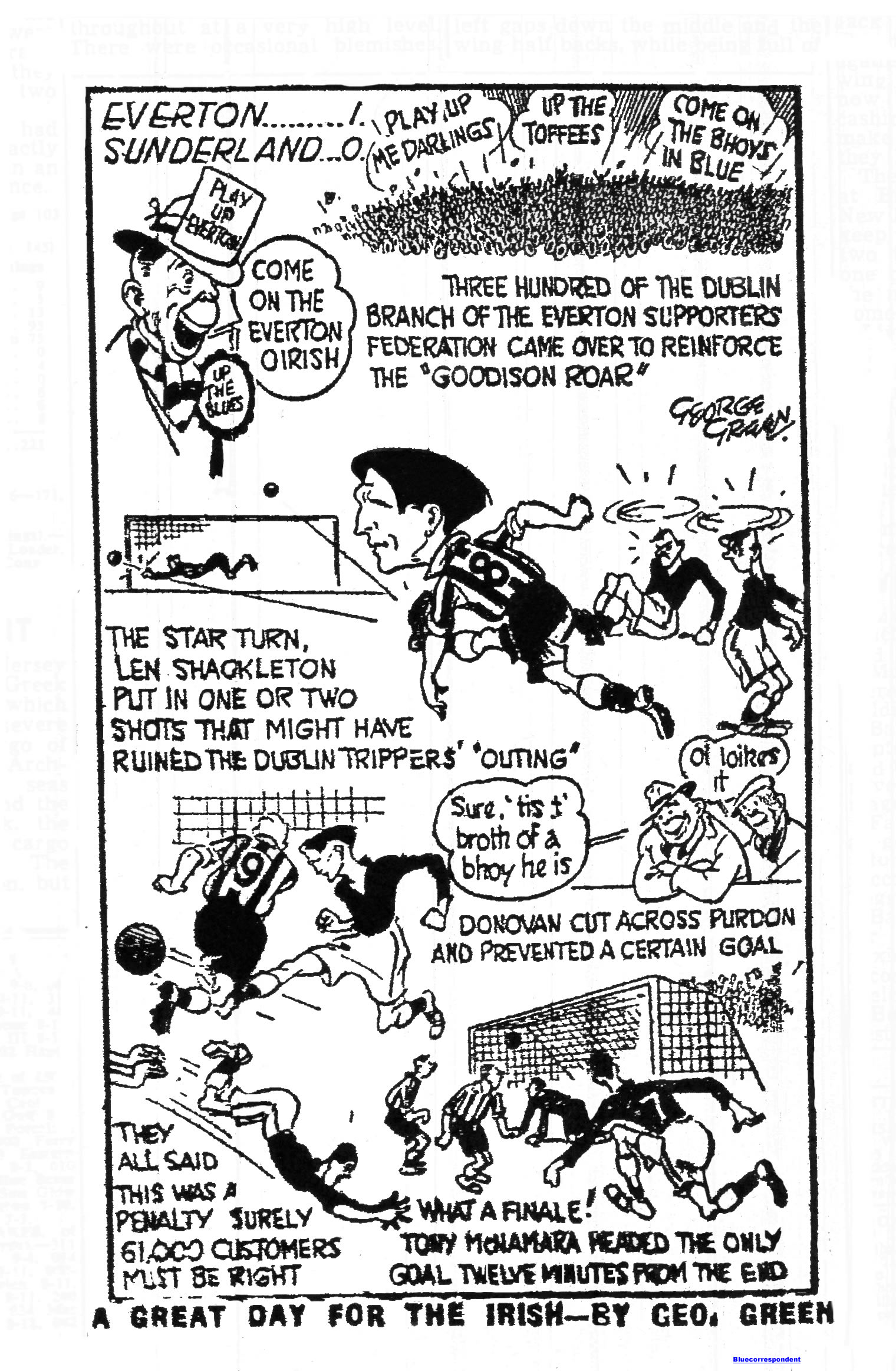 A grand move in which all five Everton forwards took part ended with an Eglington shot which dropped over the bar this was followed by two United attacks, in one of which Moore headed Taylor’s shot behind and while Berry hit the net support in the net. A McNamara header off a free kick by Jones was allowed by Parker to run through his legs without, however, catching Wood napping.
