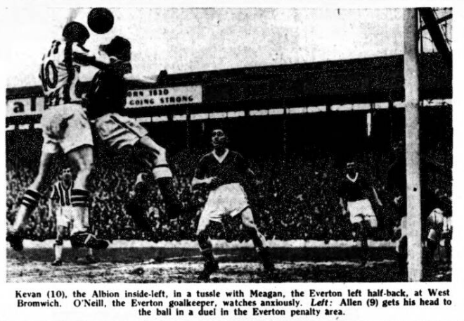 Forced to defend for long periods and never equaling the Albion’s fluent moves, Everton were lucky to share the points in a game containing too much severe tackling. Better finishing by the inside forwards would have enabled the vistors to augment Lee’s second minute goal long before Ashworth equalized eighty-one minutes later. In the Everton defence only goalkeeper Dunlop reached his normal form for the full backs failed to curb the Albion’s enterprising wingers even when right back Donovan and right half Brian switched positions after the interval.