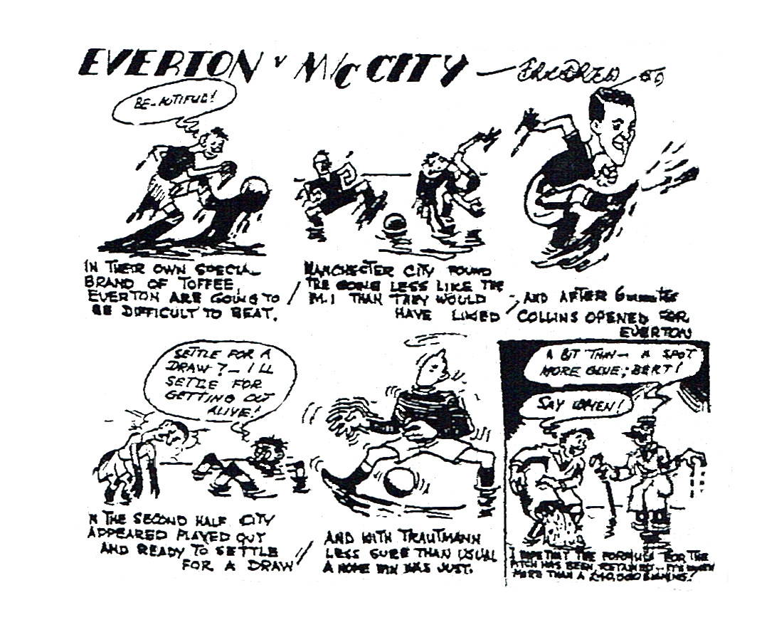 One could not help feeling that the Everton forwards were overawed by the Trauntmann reputation. They were afraid to treat him on his current merits and always seemed to angle for that perfection of position when in fact the opportunity had they but realized it was already created. No-one could argue the respective footballing merits of the teams. Everton were undoubtedly superior, faster and more methodical. Particularly was this obvious at the start of both halves and in the furious finish that produced a goal, which many thousands did not see for the simple reason they had abandoned the game as a draw and left the ground before the end. For the most part it was Collins who prompted the progress. Not only was he the idea man but he cracked the whip and his team mates danced to his bidding, but this time it was not a rampant irrepressible Collins, for there were long periods when City were able to bar his way most effectively. Festive football, skilful as it was interesting sent the match away to a great start and if Thomas had opened the proceedings with two goals in five minutes or so, it could have been sensational. The chances were definitely there, not quite clear cut maybe, but still better than outside possibilities for the man with the ability to take them. Thomas did not measure up to this offering extraordinary and it was left to Collins in six minutes to show that Trauntmann could be beaten by a genuine shot from kindly job offered by King. Instead of collecting a crop of goals Everton coasted along with a sort of ill-concealed disdain of the opposition and if the conceit had presented them with an account beyond their ability to pay, they could have blamed nobody but themselves. As so often happens in periods when Collins was eclipsed, Everton were relegated to the shadows.