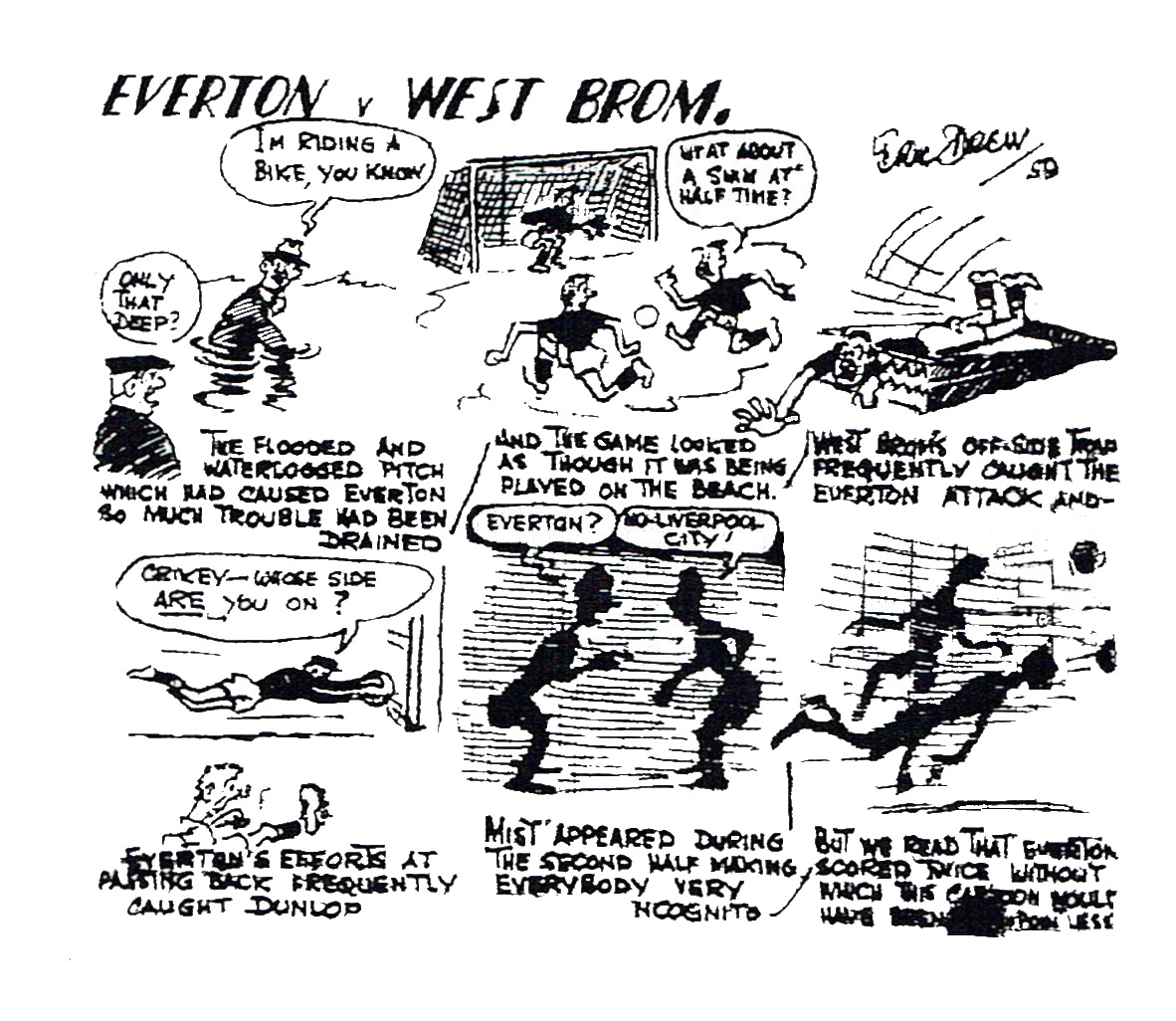 Tomorrow’s game at Goodison Park takes place through the unrelenting effort during the week of the Everton ground staff and their helpers. The floodlights of Goodison have burned far into the night in order to illuminate ways of getting a waterlogged pitch drained in time for the tilt against West Bromwich Albion. Through the Everton team have played well the going has been at it heaviest this season; this is hardly worth the agonies of suspense endured by the Ground Committee chief Mr. John Sharp and others and you may take it for granted that the spade-work of drainage will continue until every affected part is made good. Everton have settled down to an unchanged side and with young Brian Labone developing magnificently to the last six weeks we are now beginning to get tangible evidence of Mr. Manager’s desire that football, above all should entertain. The point taken from Preston was further indication that Everton are going all one way- the right way. Albion, even with their England Under-23 captain Setters, who is under suspension are not the fine side they were and Everton, in their Leicester, Birmingham, Manchester United form, should win with something to spare. Everton; Dunlop; Parker, Jones; King, Labone, Harris (B); Harris (J), Thomas, Shackleton, Collins, Laverick. West Bromwich Albion; Wallace; Howe, S. Williams; Drury, Kennedy, Robson; Aitken, Burnside, Allen, Kevan, Hogg.