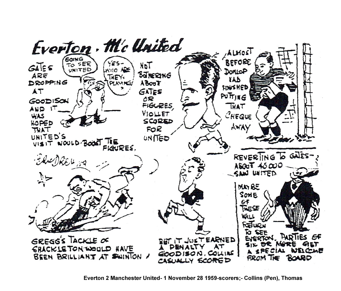 Here we had Quixall possessor of reputation unlimited and costing Manchester United well over £40,000, and yet never remotely in the same class as Bobby Collins, a player whose price was only half. Not all signings go right but whatever other disappointments Everton may have experienced, the acquisition of Collins is one stroke of business with a 100 per cent dividend. Some of Shackleton’s work was pleasing and it was a mark of his achievement to hear the crowd encouraging him. “Well done Shack” but if only he put greater speed and purpose into his work, it would he easier to create a more lasting impression. I don’t think there is any doubt he would have scored in 38 minutes when he pulled the ball clear of Gregg only to fall to an ankle pull by the goalkeeper, which shrieked for the penalty which Collins converted so effortlessly. Parker too, played his part in Everton’s defensve grip and only on two occasion did Dunlop create any alarms. First a Bradley shot almost eluded him to be stopped on the line, and secondly his clearance kick struck Scanlon’s back in the final minutes and might easily have rebounded into goal. wing halves and full backs were unconvincing enough to cause United manager Mr. Matt Busby, food for anxious thought. Charlton’s slide from his pedestal seemed to me as much due to lack of support as anything else. United either do not appreciate his worth or are just not sufficiently able to exploit it adequately. Everton;- Dunlop; Parker, Jones (captain); King, Labone, Harris (B); Harris (J), Thomas, Shackleton, Collins, Laverick. Manchester United;- Gregg; Foulkes, Corolan; Goodwin, Cope, McGuinness, Bradley, Quixall, Violett, Charlton, Scanlon. Referee; Mr. A. Holland (Barnsley). Attendance 46,095.