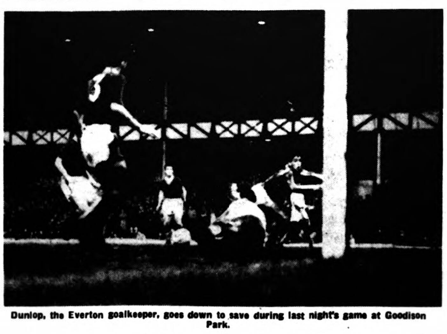 Dunlop had not had a save to make in this half and Jones had not been very much busier, although Everton had dominated the game up to the penalty area where the inside forwards were inclined to crowd by standing a few yards of one another. On the stroke of half-time a brilliant movement from Everton, starting with Parker deep in his own half and going via Bingham and Collins to Vernon saw Jones make an excellent catch from Vernon’s quick hit shot.