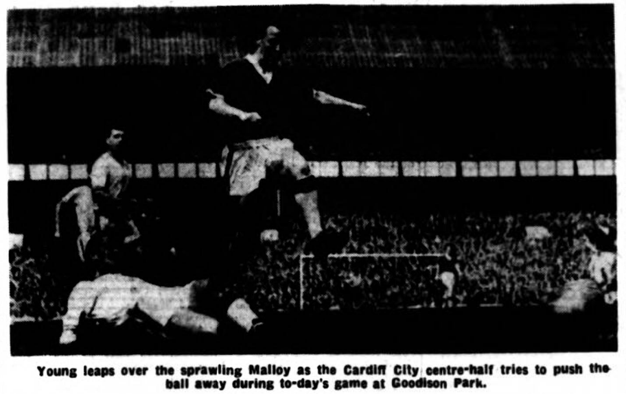 Young's first goal came after 24 minutes when he cleverly headed in a Fell centre, following good approach work by Vernon and Fell. His second came after 55 minutes after a long through ball from Collins had caught the Blackburn defence unawares. Right back Taylor was slow to clear and Young gained possession, lobbed the ball over the Blackburn man's head and calmly stepped round him and drove the ball home. Vernon also played a fine game for Everton and it was fitting that he should score the other goal. This came at the 26th minute, when Reeves, Woods and Clayton got into an awful tangle over a harmless Gabriel lob, and Vernon was able to take possession and score from close range. Blackburn consolation goal came in the closing seconds through Dobing, following good work be Bryan Douglas. Douglas had started off as if he was going to beat Everton by himself, but Thompson soon got his measures and the England man had to move into the centre to find a way through.