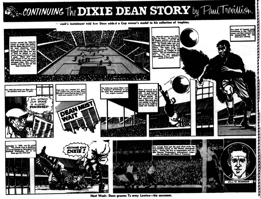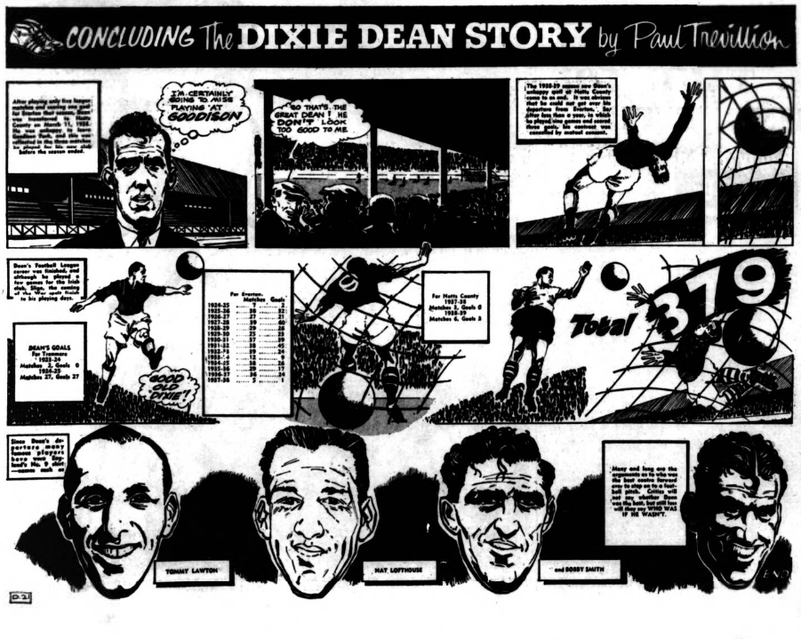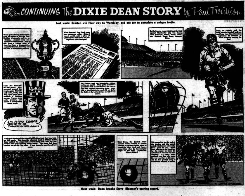 Webber headed over and Tryer’s lob must almost have grazed the bar on the upper side, but the save which will be remembered when all others are forgotten was from an Edwards header. The match hung on that single incident and inches decided against Everton. The direction was flawless as Cowan flung himself at the ball and retrieved it at the second attempt when it must have been actually on the line. This was excitement clean above ordinary expectations, but flesh is only human and without the reward of success Everton naturally began to tire. With one minute to go a needless conceded free kick by Parnell gave Murray the chance to drive the ball into goal. No one dared leave the ground before that goal for Everton were the great dictators capable of snatching an equaliser and even a winner, against a desperately packed defence. If I had to name the outstanding player among so many brilliant performers I would unhesitatingly plump for George Sharples, a lad to whom his colleagues looked for leadership and my goodness how they got it. Jarvis less forceful but almost equally effective was another great player.