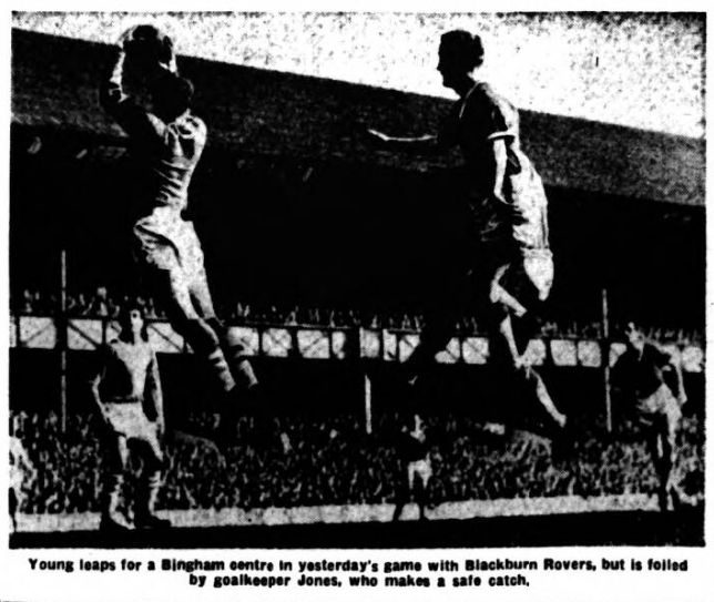 Woods and Newton were doing particularly well for Blackburn as Everton kept command of the game, with Dunlop not having touched the ball for some ten minutes. The game continued to be a bit of a scramble all round, with Everton holding the upper hand in midfield but unable to establish a clear-cut opening near goal. They had the Rovers’ defence in a bit of a tangle, however, when Bingham floated over a good centre which Young missed with his head and Fell, behind him, nodded it down into the hands of Jones. Neither Collins nor Young could get their passes going well but Collins brought a spot of light into the match with the best shot yet, but it was straight at Jones who had no trouble at all with it. Blackburn were even worse in their attacking ideas, although Thomas was doing quite well and looked the best of the line. Up to now this had been one pf the poorest games seen on the ground this season. One incident of some note was when Thomson dispossessed Douglas in midfield and moved up to take a pass from Vernon in the centre forward spot, but was dispossessed by woods who was one of the few players who was playing with any certainty. After 38 minutes came a memorable event for Everton when Young scored his first goal on the ground. He went up perfectly among a group of Rovers defenders and headed a free kick from Gabriel past Jones into the net. This had been very much the highlight of a disappointing half and full marks too Young for the way he got up in the air to beat men inches taller than himself.
