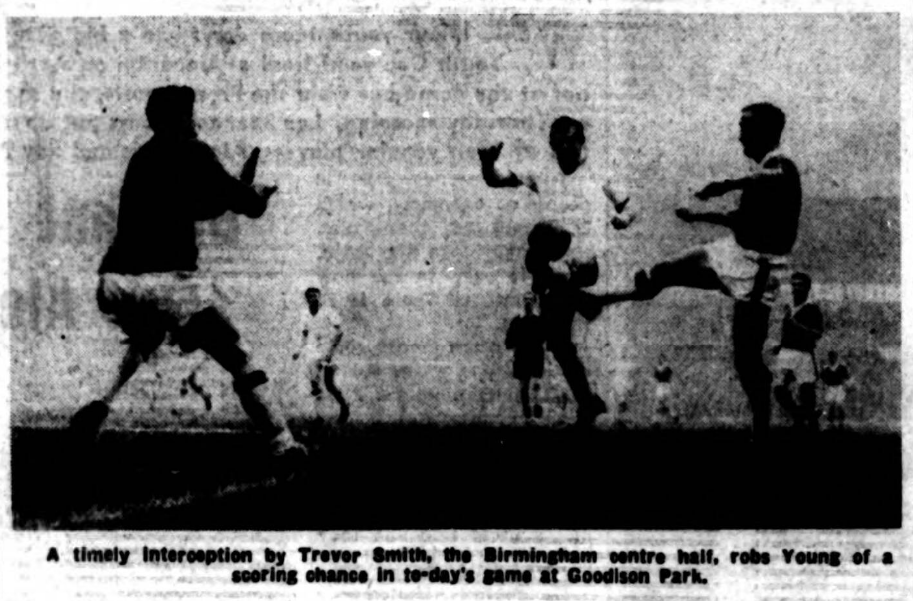 Everton’s best scoring chance came from the best of these never-to-be-forgotten weaving runs by a player who has taken a good deal of time to settle down, but who has now made a firm niche for himself in the hearts and affections of a crowd who love football finesse above all else. Having beaten Smith and left him far behind, Young ballet-danced his way through the rest of the defence and then dragged the ball back from the line, giving Temple an open invitation to mark his return. Temple struck his shot well and solidly, but the ball hit an upright and bounded out. Young had little chance to beat Smith "in the air," but on the floor it was a different story. Even with Collins and Vernon pestered and chivvied by half backs who fought for the ball unceasingly, the Everton line enjoyed chances and should have had the match sewn up long before the finish. And that is not detracting from the work of the Wrexham boy, Hennessey, who made Collins his special mission, or from the excellent goalkeeping of Withers. When this giant goes up for a corner kick his hands usually get what they seek. He timed a deflected Vernon free kick beautifully and made a glorious save from a Vernon header, opportunity for which came from a perfectly flighted pass by Young. It was tough, unrelenting football all through, if not at cracking speed, and when the ground dried out a little and became sticky Vernon and Collins both found its tackiness hindering their attempts at close working the ball. Birmingham gave their captaincy for the day to Jimmy Harris. It was good to hear the crowd give him a hand for old time's sake, though they realised well enough what a lean time their club have had since the day he went! Harris has rarely played better, Labone had him as well collared at close quarters as Smith had Young, but at other times Harris spread passes very expertly and was exceptionally good in the air.