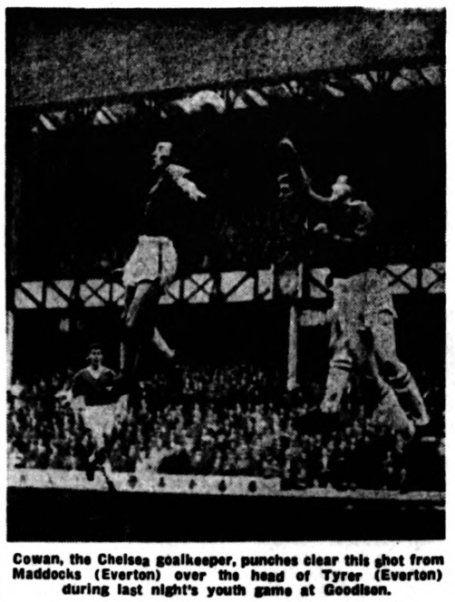 If Everton dominated the exchanges in the first half than they monopolised play subsequently so much so that Chelsea almost looked like intruders when they crossed the half-ay line. Everton could easily have gone ahead, 22 minutes when Webber with a shot from 30 yards out beat goalkeeper Cowan and left a black smudge on the crossbar as testimony to the nearest of near failures. The live-wire Webber laid on a perfect opportunity, which Maddocks squandered, but Everton received no more than their due when Edwards finding himself in the clear from a corner kicks, seemed to take an eternity to hit the ball, but when he did it was the most perfect lob and in 35 minutes inroads into the deficit had begun. With Everton’s second goal coming in 54 minutes the stage was set for a triumphant reply. Tyrer placed Morton in possession and across goal went his centre for Webber to flick it into goal. Now sleeves were really stripped on in earnest. It was easy to see Chelsea’s concern. They wasted time whenever possible, pushed the ball out of play, passed back to the goalkeeper and indulged in a variety of safety-first tactics, which showed they had been well drilled to meet such an emergency though the experience has been. Everton continued to thunder forward and at any moment it appeared the equaliser must come. Webber nearly did the trick with a block-buster of a shot that screamed only just wide and Tyrer seized on a pass with only Cowan to beat but the young goalkeeper barred the way with his body, and Tyrer simply could not clear him.