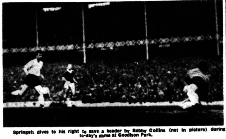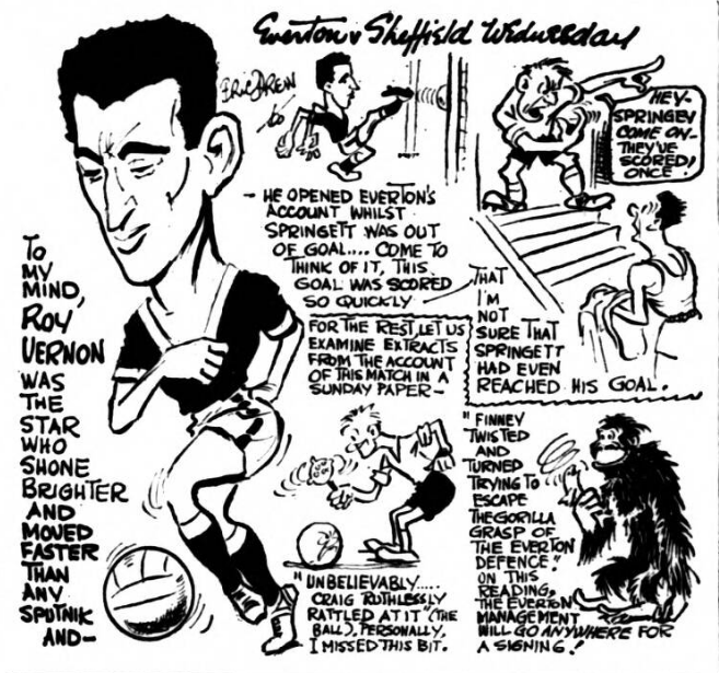 Wednesday were a great side for 45 minutes and led deservedly, by 2-1, at the interval. Then, as so often happens, Everton slipped into top gear and the others looked second best and finished second best. There was one moment at 3-2 when Fantham might have scored if he had chosen to shoot. Instead, he tried to tee-up a certainty for Finney and Finney's re-action—and shot—was deplorable. Thus Jimmy Harris (wanted at West Bromwich, but by no means certain to go there) was able to go on to get the clinching fourth, from a Vernon pass, a few minutes from time. And 4-2 about represented the difference between the sides. Few goals this season have been greeted as deliriously as the one Vernon got in the first minute. Craig had had his shot blocked by the towering Labone and Fantham had seen his deflected shot brilliantly anticipated by Dunlop before the goalkeeper, kicking from hand, punched the ball far up field to the region of the far side of the centre circle. Here Vernon, who had anticipated the skid of the ball as it struck the turf, was able to gain possession, draw Springett and then calmly turn the ball slowly into an open goal. The crowd's reaction was to jump for joy, and if you've never seen 50,000 fans do this, with a forest of waving arms for good measure. You’ve missed one of the sights of our football-crazed city. Wednesday might have been excused losing morale, but they didn't, and when they levelled the scores many must have had niggling doubts about the possible result.