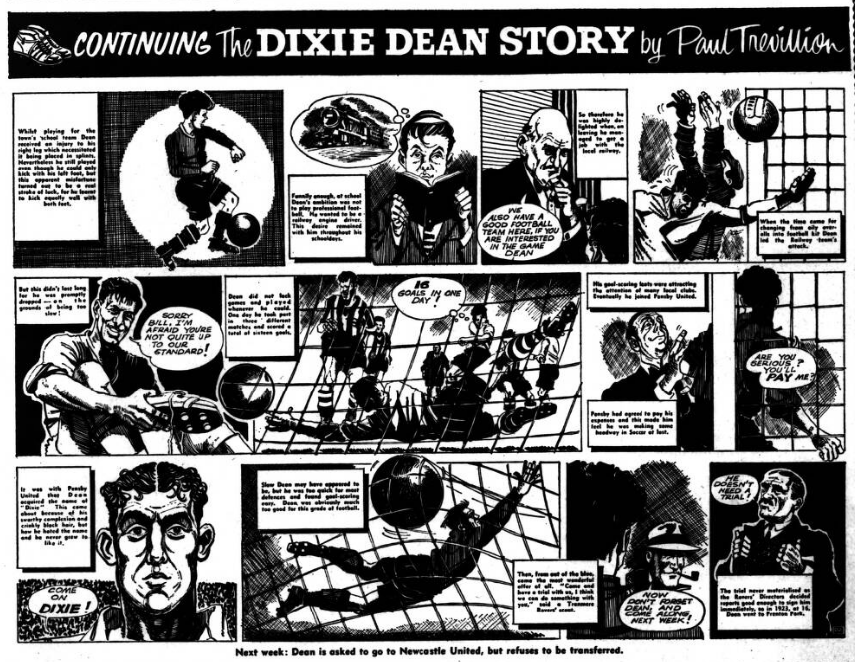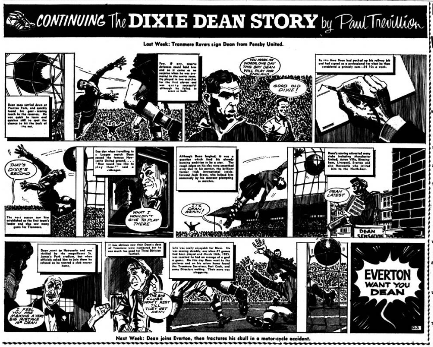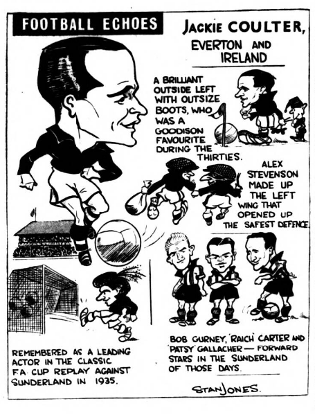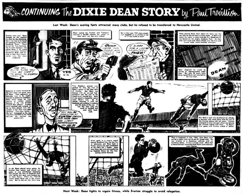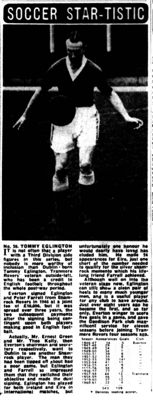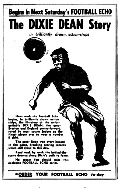 IN the days when Sandy Young played for Everton the weekly wage was not £24 but £4. Bob Trueman, from Birkenhead, was recalling this when telling me how Sandy, after leaving Everton for Spurs, joined South Liverpool in their Grafton Street days and was promised by the late W. J. Sawyer £2 a match for the rest of the season. “And we've plenty of matches." he added. Sandy Young signed and, due to a glut of fixtures, played five times in his first week! Then he went off to Will Cuff, at Everton, and said. "Fancy, when I played for a great team like Everton I was on £4 a week; here in my first week with a village team I've drawn a termer!" Mc. Cuff's retort can only be imagined. Bob Trueman, who knew Sandy Young well, explained that he was one of a few with a gimmick (no such word in those days). He invariably went on field wearing a solid black, leather belt. Everton Idols, wee Alex Stevenson and Dixie Dean (whose life story strip begins next Saturday in the Football Echo) are again in action alongside each other. Dean has been licensee of the Dublin Packet in Chester for some Years; now to his left, the position he occupied when they were at Everton, is Stevenson who has become host of the Shropshire Arms. As soon as he heard of the arrival of Alex, Dixie went along to see the 5ft 4 ½ in, Irishman who played at inside-forward with him for three years. In Dixie's bar are ranged the impressive array of international caps he gained while playing for England. Alex has countered with his equally formidable collection of Irish caps—about 20—a few gained when he played for Glasgow Rangers and the remainder while he was with Everton. Stevenson left Everton in 1949 and became a national coach with the League of Ireland. Later he was manager of the Waterford club. Other Everton players who are now licensees are Norman Greenhalgh (Bromborough Hotel), Ted Sagar (Blue Anchor. Aintree), George Burnett (Pilot Boat. New Brighton) and Eddie Wainwright (Medlock Hotel, Liverpool).