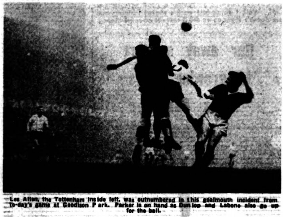 When Collins stepped aside from a penalty kick after Johnson pushed out a Jimmy Harris header from under the bar, and said to Vernon. “You take this Roy,” It was almost an acknowledgement of the fact that this was Vernon’s day. With a disarming subtlety he lobbed the ball past Springett and Everton were on terms. While Vernon danced, dominated and devastated to give his finest show in an Everton jersey, made the more commendable because it was achieved against opposition as tough and capable as there is to be found anywhere Collins was content to fill a minor role, well though he played. Behind them Labone was less robust, but just as uncompromising as the flint-like Swan, and Brian Harris and Jimmy Gabriel, tackling like machine were always on the look-out for chances to convert defence into attack. Although there was a general excellence about wing halves in this game, not easily matched none of them I though excelled. Harris in his attacking excursions. If there was ever a query about this lad’s qualifications to rank with Everton’s great players it must now have gone. It took 61 minutes for Everton to lead for the second time and again Vernon was the man behind the goal. His free kick following unceremonious treatment of Bingham skimmed along the ground, Bingham opened his legs to allow free passenger and at the last spilt second made a deflecting contact, which caught the defence on the wrong foot. All Johnson could do was to stab out a protesting foot, which simply helped the ball over the line and Goodison echoed and re-echoed to an outburst of frenzied enthusiasm.