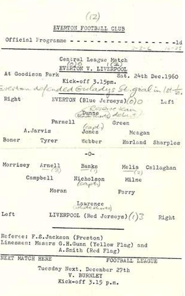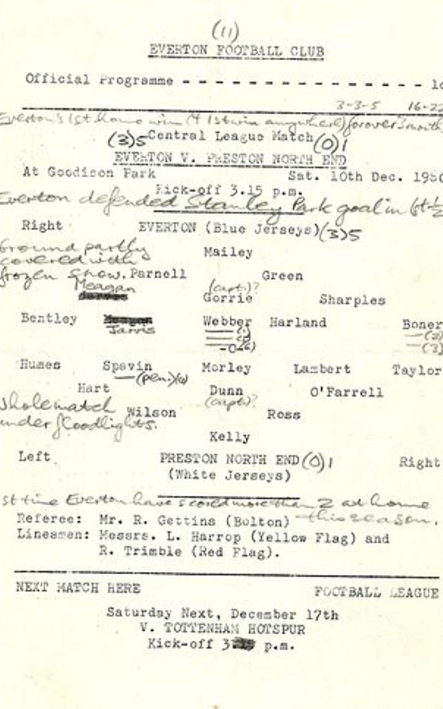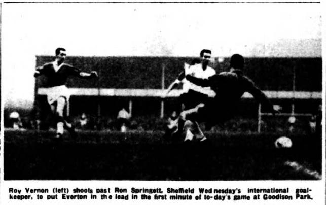 One or two notable alarms were to be sounded particularly when Finney skied the ball over the top from an admirable position before Everton set all doubts at rest three minutes from the end, Vernon it was again who measured a through ball to Jimmy Harris to perfection for the winger-turned centre-forward to hammer the ball home. This was Everton’s joy day complete, for the victory was emphatic, meritorious and positively inspiring. In a scene crowded with talent, Vernon was gifted enough to undisputed the starring role. He was the man Wednesday could not control. Whether he was laying wide the way for others or tearing through on his own, he was equally effective and only a combination of bad luck and Springett splendour prevented him gaining his first Everton hat-trick, although he has now score fourteen League goals. Finney needed only a few minutes to decide that an afternoon’s opposition to a Parker in tip-top form was just about the most futile way of spending an afternoon and promptly exchanged wings with Griffin, a move which imposed an impossible strain on Thomson on view at Goodison for the first time. Still struggling to adapt himself to the change of pace, Thomson was on the losing end throughout but that he is a first class long term prospect I am convinced. Until he settles into the rhythm there must inevitably be anxious moments. One could scarcely be other than enthralled by the work of Kay, the essence of competence and Craig was a lurking menace who had to be kept on the tightest of tight-reins. An incident which received more applause than most was when Vernon raced up behind an opponent and with a dexterous flick took the ball yet how many realised that this was a replica of the move which brought his dismissal at Nottingham. The difference was that this time Vernon got the ball. On the other occasion he got marching orders, but the game at least showed that Vernon has pushed the apparent injustice right out of his system. Everton; Dunlop; Parker, Thomson; Gabriel, Labone, H. Harris; Bingham, Collins, Wignall, Vernon, J. Harris. Sheffield Wednesday;- Springett; Johnson, Megson; McAnearney, Swan, Kay; Griffins, Craig, Ellis, Fantham, Finney. Referee; Mr. W. Clements (West Bromwich). Attendance 50,702.