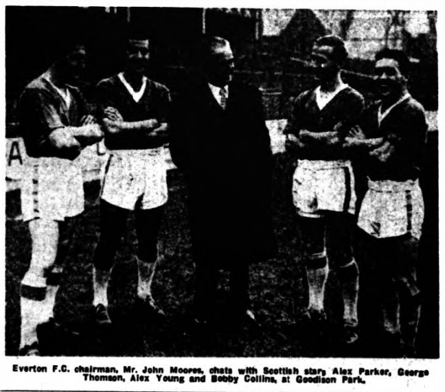 The first home appearance of former Hearts full-back, George Thomson, who made his debut for Everton at Highbury last Saturday coincides with the visit tomorrow of Sheffield Wednesday. Thus an early attractive match becomes a must for thousands of fans who want to see their team confirm the belief that they are a better side than the Championship rivals and one who may well demonstrate in a fortnight’s time that they are better than Tottenham, too! Everton’s defeat a Highbury –a galliant one after being three down quickly- has been their only real set-back for a long time. I don’t think it will affect their confidence and though Wednesday are the only team to have beaten Spurs this season one must not forget that Everton ran the London side goalless until the last ten minutes in the season’s opening game. Everton have everything a good side needs- at least they will have when Young is fit to take his place “in the middle” –but Wednesday, who certainly don’t stand on ceremony, will pose a big problem for them. The one certain about the match is that it will produce entertaining football. Everton’s main aim is to do this and never in my memory has it been so possible to go to Goodison Park not hoping to see the game’s arts, but certain to have them display, whatever the result. A man who has watched football for countless years told me yesterday that his opinion was that Bobby Collins was the finest inside-forward, offensively and defensively he ever saw. When you study the little man’s repertoire of art, strength, punch and ability to head a ball his contribution to the side’s success is bound to be enormous.
