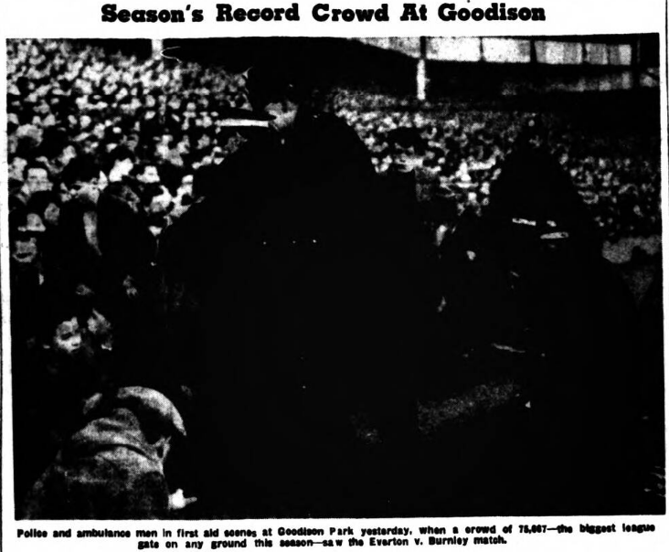 Hundreds of people were crushed against terrace walls and barriers at Goodison Park yesterday when the mammoth crowd for the Everton v Burnley match swayed and lurched. Police went into parts of the 75,667 crowd and helped to remove many boys over the concrete wall to the safely of the running track. St. John Ambulance men dealt with many fainting cases. Spectators described conditions in the crowd- hundreds had been turned away when the gates were closed shortly before the kick-off-as the worst they had experienced. In 2s 6d ground spectator described the situation as “sheer murder.” “It was only by using force that I managed to free myself when trapped against the end of a barrier,” he said. Other spectators said that the boys’ pen looked no more than comfortably filled and thought that the boys being pushed about in the crowd would have been much safer in the pen. There were many women in the crowd were helped to safely. But for prompt action by police, said spectators, there might well have been serious injuries.