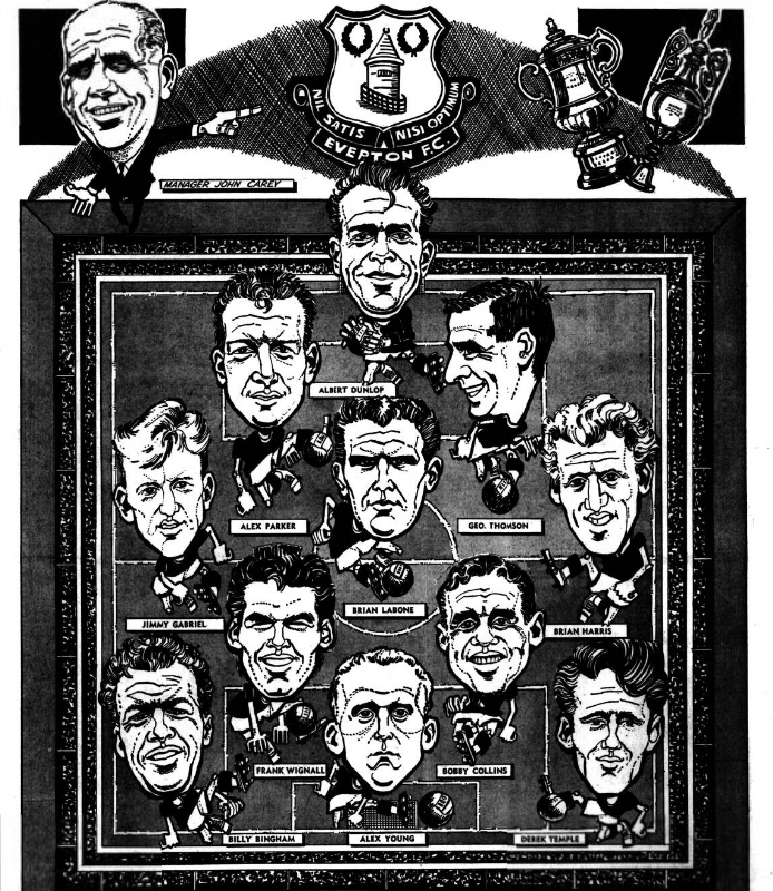 Frank Wignall hit the woodwork once, Bobby Collins hit it twice, and offside spoilt another goal. Still, I am still convinced that the way we were playing, if the game had gone on another 10 minutes we would have gained at least one point. Talking with George Thomson, our new left back, afterwards he told me how much he had enjoyed his first game in English soccer, despite the defeat. The first question any Scot is asked when he comes down here is about the speed of the game, and George told me he found that he did not have same amount of time to move the ball as he had in Scotland. For instance, he said, with Hearts he had time to gather the ball, and then look to see where he was putting it. Down here he has realised that the gathering and passing have to be done in practically one movement. Highbury, of course is one of the finest stadium in the country, and George was very impressed. “But." he said. “It didn't impress me as much as Goodison does. I think that place is terrific." When I heard on Monday that we were playing Sheffield United in the third round of the F.A. Cup. I immediately thought of what I had read and heard about their display at Anfield on Saturday. Apparently they are much more than an average Second Division side. They seem as certain as anything is in this game to gain promotion, and I hear they play very clever soccer. As we at Everton pride ourselves on trying to do the same it should be a very good match.