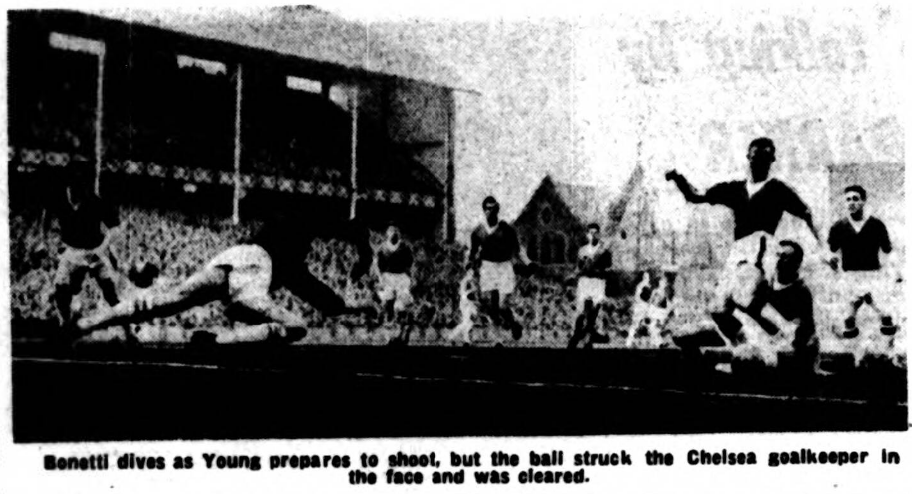 Young got into the crowd's good books with a post-hitting header after young Rimmer in attempting to head away had only succeeded in flicking the ball upwards. Certainly Young deserved what would have been his first goal for his new club for his positional sense in seizing up the chance and taking it so well. Bolton were clearly a side in trouble, for much of their work was hasty and haphazard. Young Farrimond who had made a good reverse pass to his goalkeeper a minute before brought down Bentley heavily just outside the penalty area after the Everton boy picked up a Vernon pass