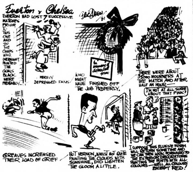 Everton, I hope, will take a leaf out of the cricketer’s notebook this week and try to hit their way out of trouble. Stone-walling is getting them nowhere and for the visit of Preston on Saturday, a match which is vital for the relegation conscious North End side, I would like to see Alex Young restored to centre forward, and left there. After all, Everton did pay £40,000 for him in that role and even in these days that is a sizeable cheque. It was not paid merely because he was Scotland’s centre forward on the assumption that he must be good. It was paid after Young had been watched several times and had measured up to requirement. The player has had no sort of a chance so far, to prove whether or not he is equal to the switch from Scottish to England football. Four times he had played in League games, twice at centre forward, once at inside right and again at outside right. Is it surprising that we are still waiting to see the real Young.” In adversity, the danger is that we began to get things a little bit out of proportion and I think that is a danger into which we are falling in regard to luckless Everton. Not for one moment do I believe that all Everton’s present troubles are due to misfortune, but I am convinced that had injury not struck me so often and so devastatingly in a department where the club were least able to ward off the blow, the mournful run of seven games without a victory would not have happened. The temptation to improvise is obvious, but Everton owe it to Young and to themselves that the Scot, now really fir for the first time since coming to Goodison Park, should be given the chance to reproduce the form which led to his Scottish caps. Many examples have there been of Scots taking an uncomfortably long time to show their true worth in English soccer, but Young, I maintain has had no sort of an opportunity so far.