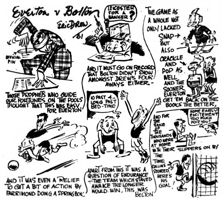 The cold weather cut the crowd to one of about 30,000 at the start of this match which saw Bentley make his League debut on the Everton right. The occasion was notable for the reappearance of Alex Young as leader of the Everton attack. His only previous home game having been all but blotted out by fog. Young Bentley started with a good stop-go movement in the first minute. It was an untidy start from both sides, with Bolton getting a couple of free kicks, one against Gabriel, and the other against Tom Jones. Everton were very luck to escape when Farrimond found Deakin with a lovely pass and the forward’s shot, although deflected by a defender beat the far post by only a foot or two. From the corner, Holden swerved in a shot which seemed likely to beat Dunlop but the goalkeeper moved fast and all was well. The crowd rose to Young for a delicious pass to Collins and it was a good mark for young Rimmer that he weighed in instantly with a first class tackle to save the situation. Then Brian Harris got the ball back at the second attempt to Dunlop after beating Birch cleverly. Temple tried a long shot when Vernon evidently thought a pass would have been more useful and then Geldard brought down the fiery Stevens for the second time and Stevens plainly did not like it. Young looked pretty small against the massive Edwards and in the air there was little doubt as to who was master.