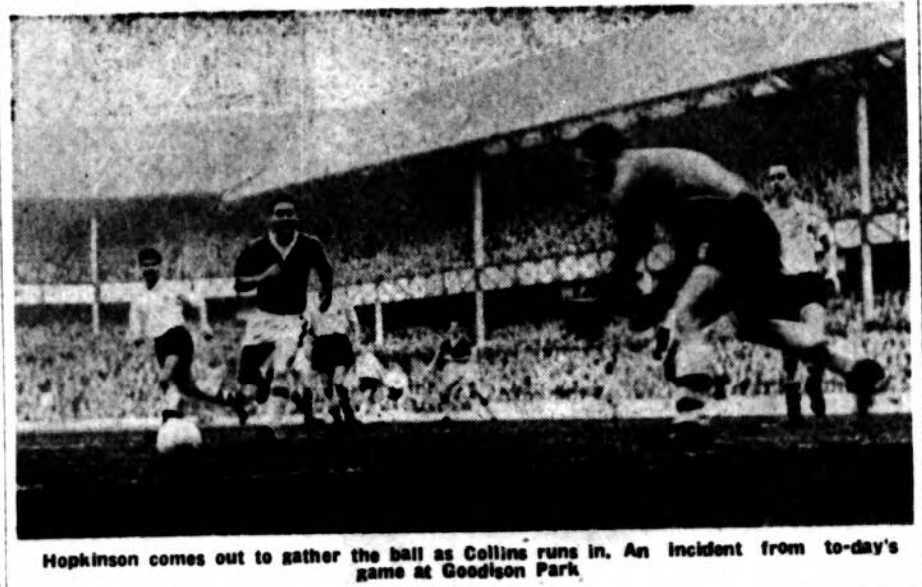 Bentley's play was a bit green with little coming from the Everton wings it was hardly surprising the prospect was so unpromising. Yet oddly' enough it was Bentley who made Everton's best strike to date. He hit a good shot after winning the bail unexpectedly in a clinch against Edwards; and Hopkinson had to bring off a real England-type save to get the ball round the post.