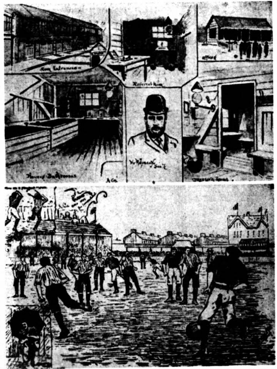 “Behold Goodison Park. The half-dozen pictures we give of this splendid enclosure must serve instead of a long description of it. In any case to substitute pictures for words is our mission in journalistic life. At the same time no single picture could take in the entire scene the ground presents; it so magnificently large, for it rivals the greater American baseball pitches. On three sides of the field of play there are tall covered stands and on the fourth side the ground has been so banked up with thousands of loads of cinders that a complete view of the game can be had from any portion. “The spectators are divided from the playing piece by a neat, low boarding and the touch-line is far enough from it to prevent those accidents which used to be predicted at Anfield Road, but never happened. In the centre of the banked-up portion, but set against the walling of the ground is the secretary’s office where Mr. Molyneux can sit ether to write out cheques in his easy chair or keep his eye on the uttermost extent of his vast dominions. The chairman (Mr. George Mahon) when play 1s on is accommodated exactly opposite and under his seat which is in the centre of the large stand, is a door leading to a passage and this is the handy way the players and referee in when the game is over, and at all events the latter personage can bid defiance to the angriest crowd. This is superfluous however, as Goodison Park spectators never throw missiles at the referee, for there is no better disposed crowd in the kingdom.