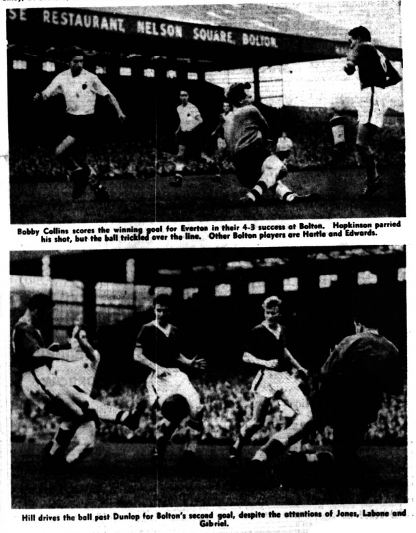 The tall Irishman was surely never offside when that clearance was made, but the linesman’s flag was up and the referee awarded Everton a free kick. It must have been a bitter blow to McAdams, who later netted the penalty, and within another four minutes fastened on to a glorious through pass from Deakin to score Bolton’s second goal in great style. It was small consolation for the disappointed Goodison fans when in the 89th minute, Bobby Collins blasted home a centre from Vernon-but at least that goal served as a pointer to where Everton had consistently gone wrong throughout the afternoon. So often Everton play attractively to clear the ball from their own half of the field; up to the opposition penalty area their football is intricate, if somewhat laboured; but having reached that stage they suddenly seem to become drained of ideas for getting the ball into the net. In the face of a dour, determined defence, Everton, too often had recourse to the long, high centre, a desperation form of attack in view of the inside trio’s lack of inches. Not until the final minutes did Vernon, who had an indifferent sort of game, move across to the right and hit a square ball along the ground to give Collins the scoring chance he relishes. After all this is a basic –if unwritten –football rule, if your forwards are dominated in the air, probe the opposing defence for weaknesses with low through passes. Until Everton do this, costly centre-forward, Alex Young looks likely to have a lean time.