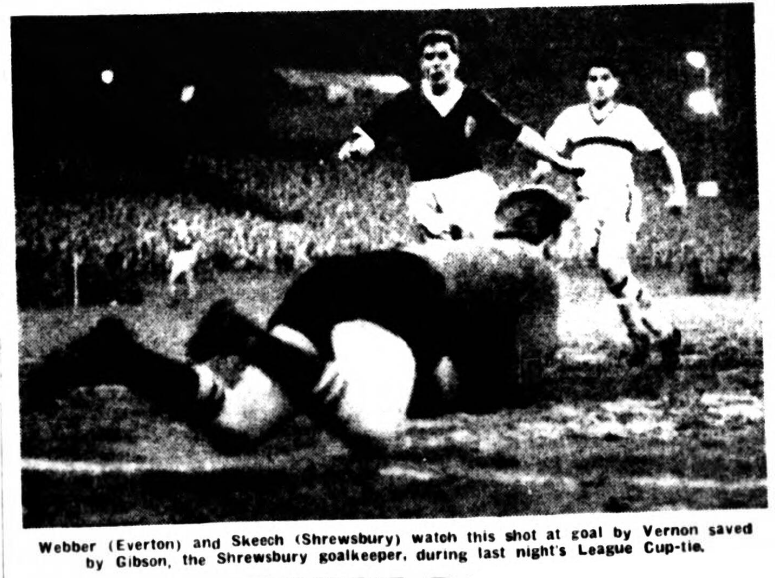 Everton were knocked out of the Lancashire Senior Cup last evening in the last minute when outside right Warren Bradley, the former England amateur winger, scored from short range. It was a fate they did not deserve for throughout the opening period their sparkling brand of open football should have produced victory. They have only themselves to blame, however, for not having a winning margin in the first twenty minutes, but their forwards missed chances galore. In the fifth minute Wignall was pushed through by Webber but with only goalkeeper Gregg to beat he fired at the goalkeeper’s body. As he tried to recover, the ball swerved away and was scrambled clear.