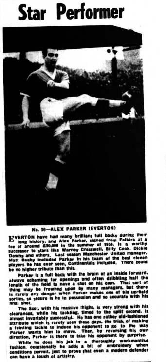 What makes a footballer, worth £42,000 or considerably more than his weight in gold. To find out I went with a cameraman to Goodison Park on Saturday to put the spotlight on Alex Young the centre forward Everton brought for that figure last November. It certainly wasn’t Young’s finest hour and a half-he finished on the losing side and failed to score. But he did enough to convince most of the 36,000 present that he’s star material. They applauded as he chipped a pass on to Collins instep from fully thirty yards; they gasped as he headed a Collins centre against the upright; and they roared when he flashed a Gabriel’s pass into the net-only to be pulled up for off-side. Playing in an unbalanced team virtually without wingers Young failed to produce Lawton-like shots or Mortensen-style dashes. But he succeeded to finding the open spaces and in placing his passes to perfection. Strong on the ball and with a natural sense of position, he always looked a player of class-though more of an inside than a centre forward. Nowhere was this more evident than in the penalty area, where he was too short to out-jump the massive Edwards. Certainly he was much more dangerous with the ball on the ground. With only a couple of games behind him in the last three months, he is naturally more than a little rusty, and no doubt Army life has done little to help him keep in trim for First Division football. When he has a better knowledge of his colleagues –and when he receives better and more intelligent support than he enjoyed on Saturday- he will surely become another of the great personalities who have graced Goodison down the years. Already the Everton fans show signs of taking him to their hearts and it was clear, most enjoyed his performances on Saturday. As one toffee-sucking character predicted; “He’ll do.”