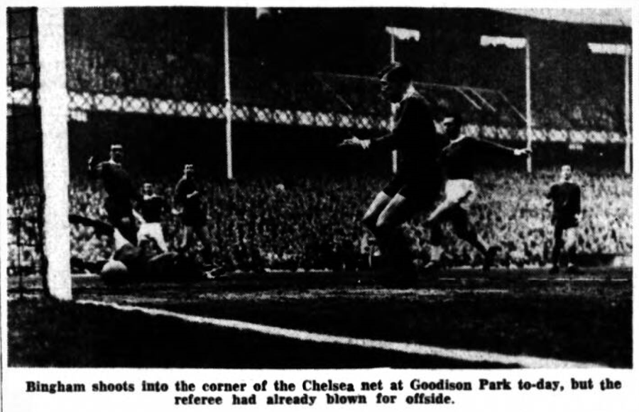 Vernon was knocked out and needed attention but quickly recovered, Hauser missed a glorious chance by ballooning over the bar and the dainty dancing, courageous Hill apart, the Blackpool line was a thing of shreds and patches. Everton were ahead in 60 minutes. It was a Young-Vernon link up which opened the way and when Stevens cracked the ball into goal Harvey made a wonderful save, but could only parry outwards. Again Young was there to receive it, and he scored readily. Only three minutes later Martin kicked a Young header off the line, otherwise we would have had a remarkable Young hat-trick, all inside seven minutes. Had Everton been satisfied with their lead, this game might well have been won, but in a praiseworthy effort to make up entertainment value for anything that may have been lost previously, they crowded on to attack. When Armfield made a long clearance, there was only Gabriel to challenge Charnley. So little had been seen of the Blackpool leader that we almost lost sight of his haul of 26 goals this season, but for all Gabriel's effort he could not prevent Charnley shooting from the edge of the area. What a shot it was! It hit the underside of the bar and West was completely beaten. I understand that one Blackpool boys' club has been responsible for producing Armfield, Hill, Martin and Durie. It would not be easy to find any better players than these in the Blackpool team. Not surprisingly Thomson was mis-timing his tackles and I thought Gabriel was the best of the halves. Everton; West; Parker, Thomson; Gabriel, Labone, Harris; Bingham, Stevens, Young, Vernon, Temple. Blackpool; Harvey; Armfield, Martin; Crawford, Gratrix, Durie; Hill, Hauser, Charnley, Petersen, Parry. Referee; Mr. L. Ticebuck (Halifax). Attendance 38,302.